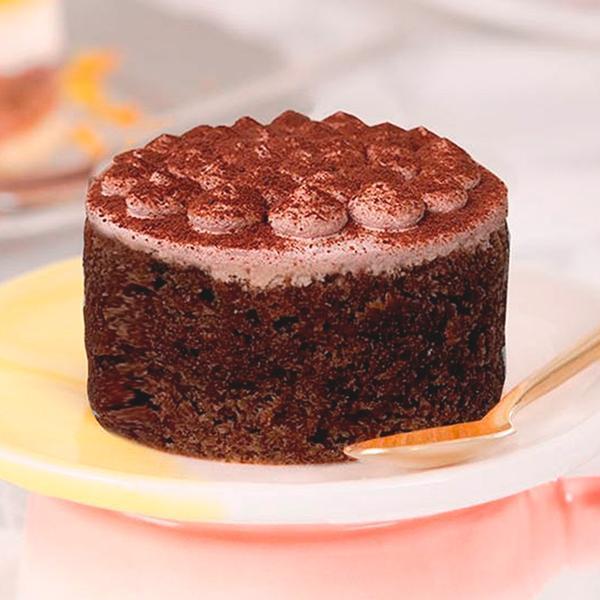 Bizcocho de chocolate relleno de mousse de café mocca y vainilla. Tamaño de 1 a 2 porciones de 60 gr aprox.