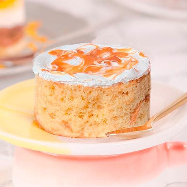 Bizcocho de vainilla bañado en salsa de tres leches, cubierta con una combinación de crema y arequipe. Tamaño de 1 a 2 porciones de 60 gr aprox.
