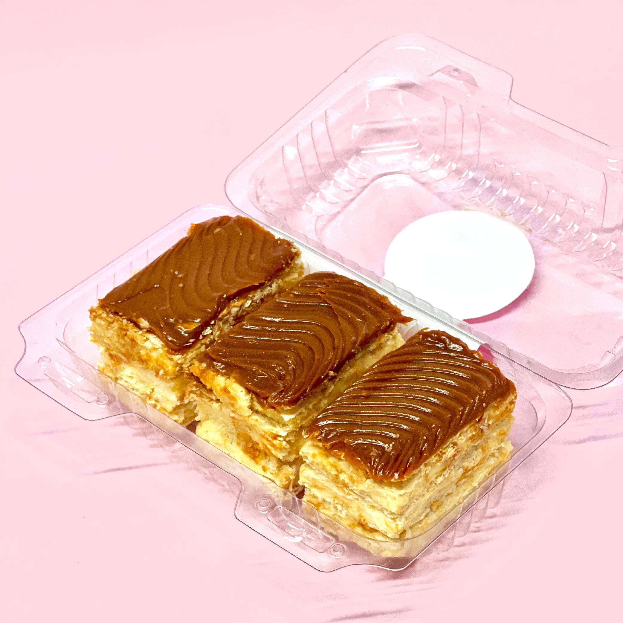 Delicioso combo de milhojas x3 unidades, cada una rellena de crema inglesa y con cobertura de arequipe.