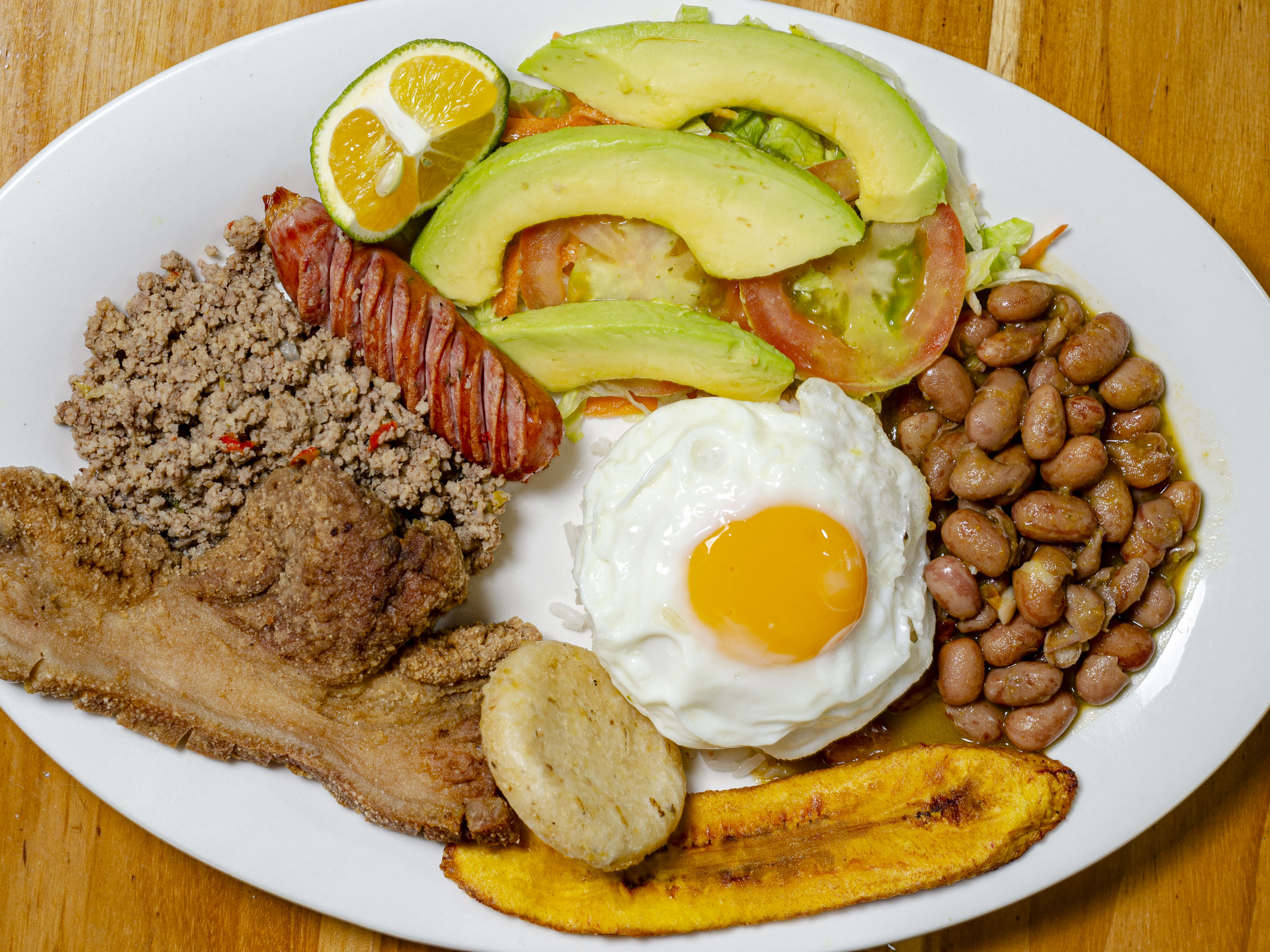 100 g De chicharrón frito, 100 g de carne molida, chorizo santarrosano de 6 cm, aguacate, arroz blanco, maduro, frijoles, huevo frito, ensalada.