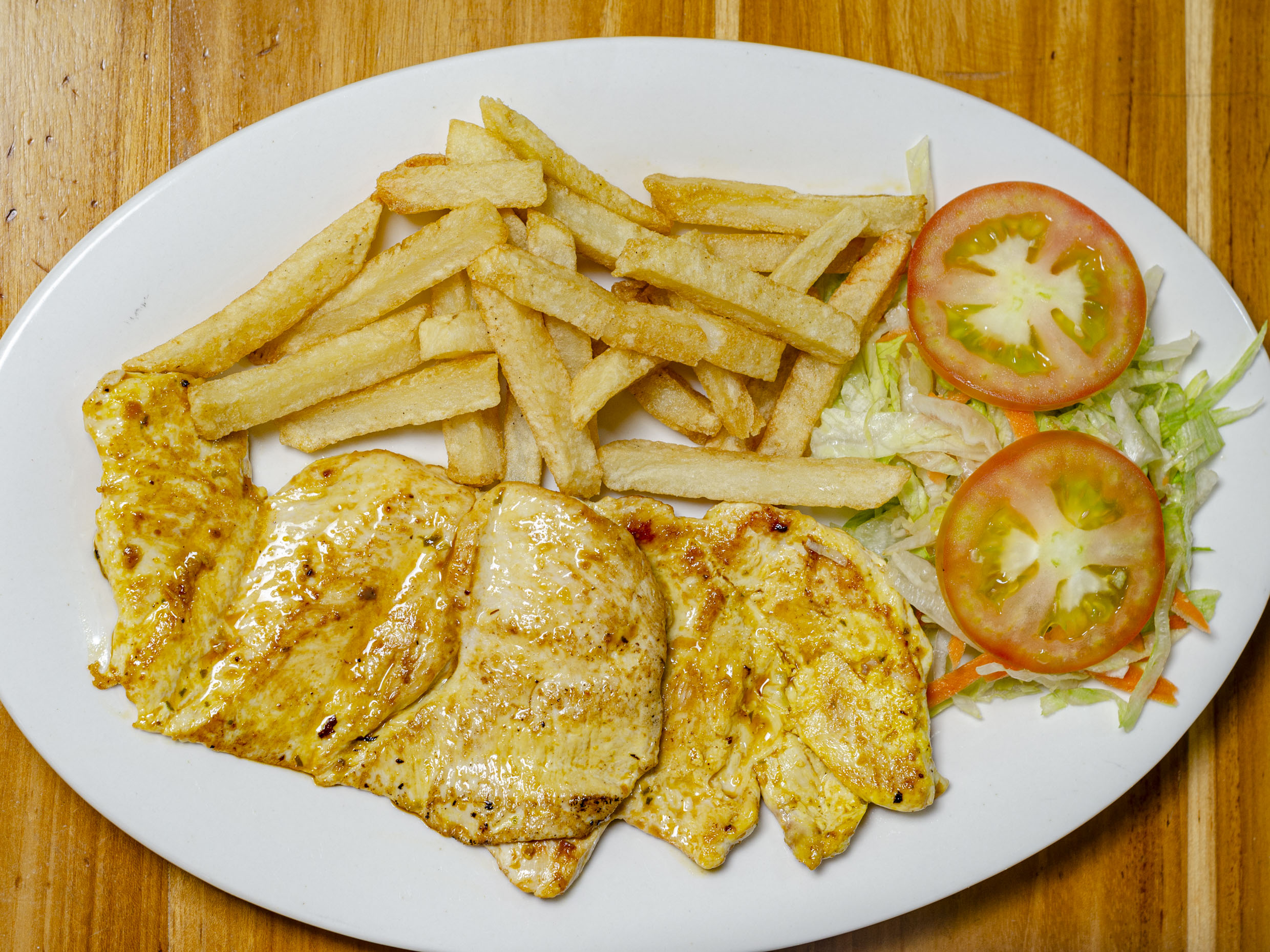 300 g De pechuga de pollo asada, acompañada con papas a la francesa, ensalada.