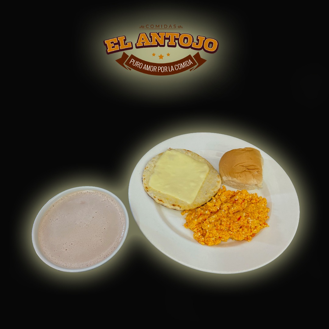 2 Huevos revueltos, arepa de tela con queso mozzarella, pan, bebida caliente.