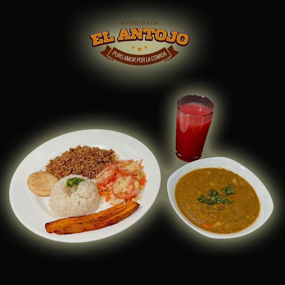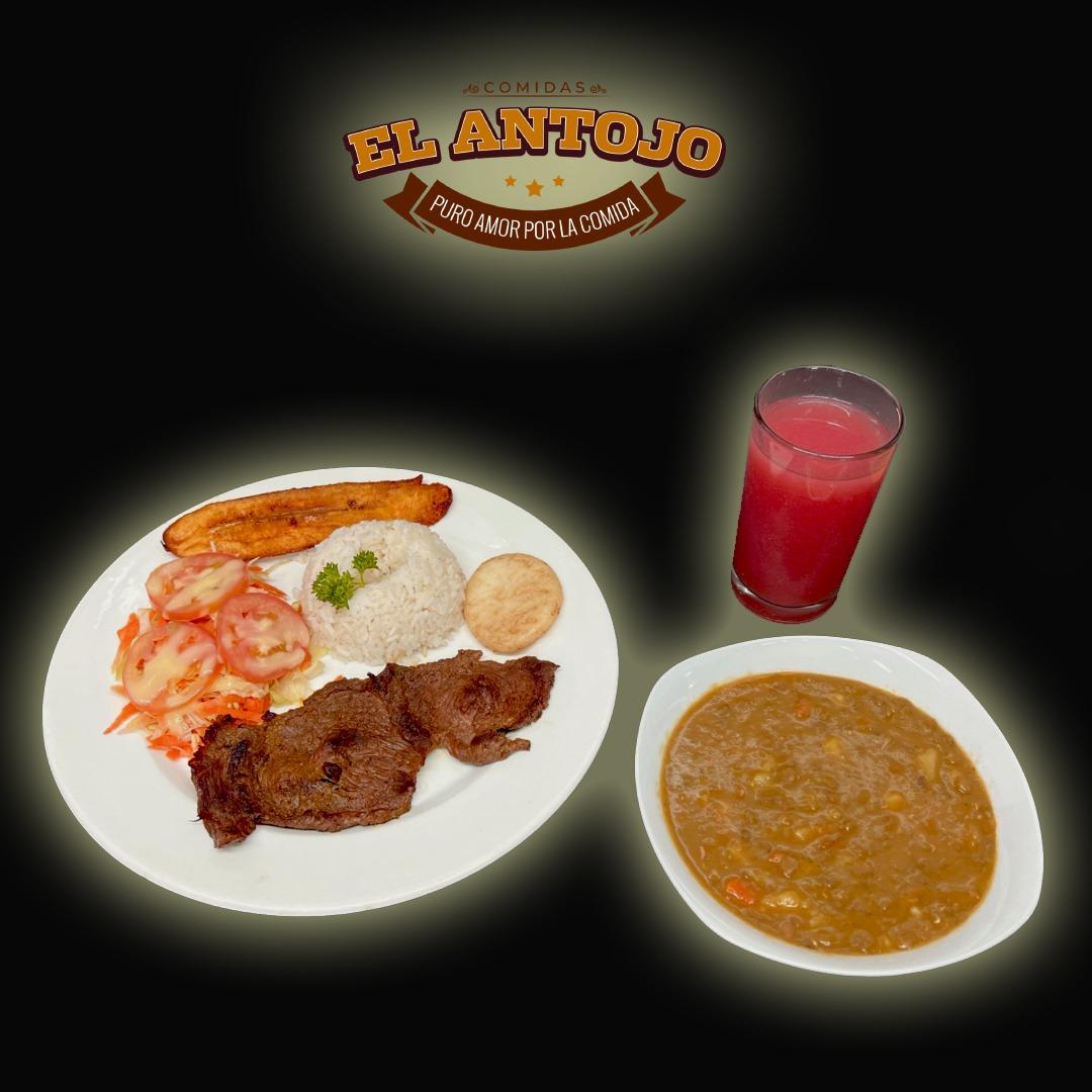 120 g De proteína de carne de res asada , arroz blanco( 1 porción personal), maduro (1 tajada), ensalada, arepita ( 1 pieza) , frijoles o sopa de (12 onzas ) , jugo de ( 14 onzas )