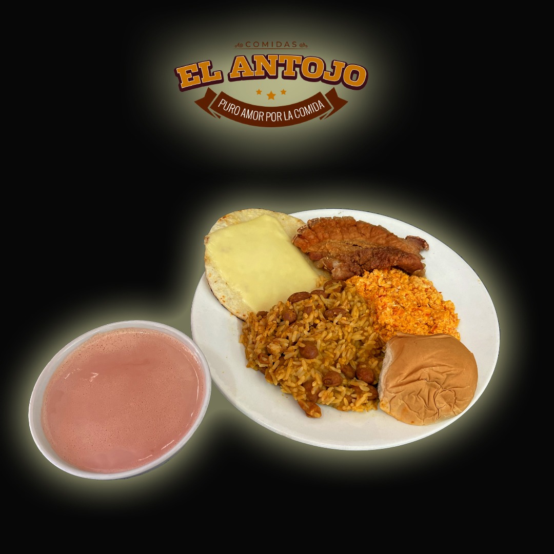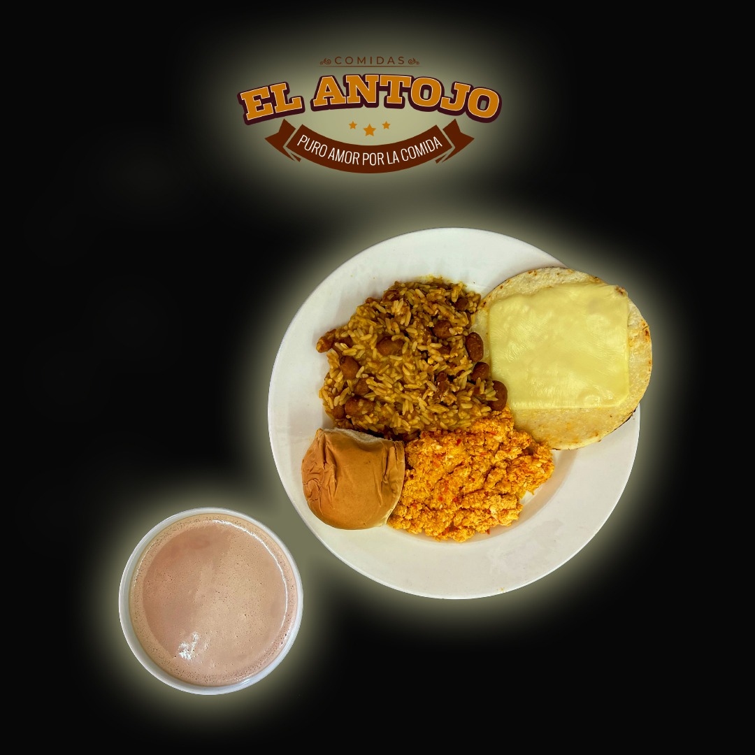 Proteína, arroz con frijoles, 2 huevos revueltos, arepa de tela con queso mozzarella, pan, bebida caliente.