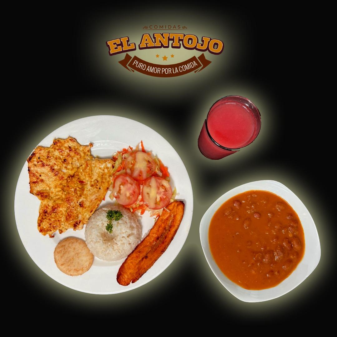 100 grs de pechuga de pollo, arroz, ensalada, maduro, arepa, sopa del dia o frijoles, jugo del dia o guarapo