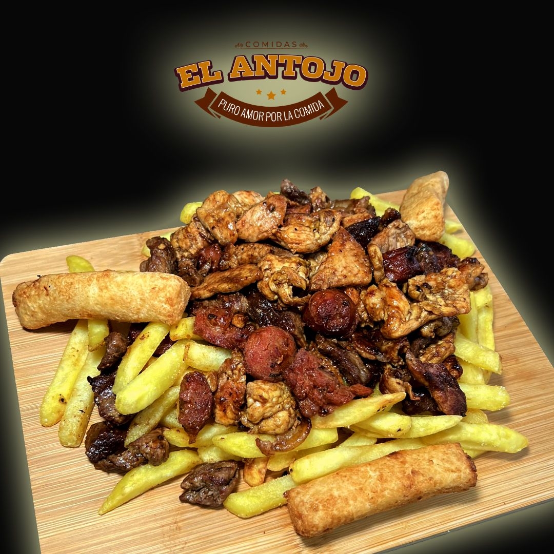 300 grs de Papas a la Francesa, 100 grs Pechuga de Pollo, 100 grs de Chicharron Frito, 70 grs de Res , Chorizo Santarrosano, Yuca
