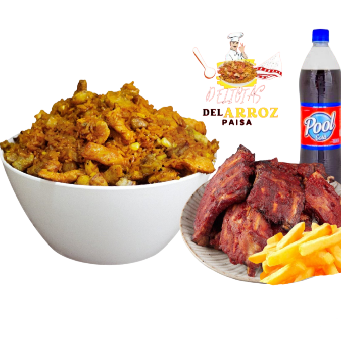 Arroz Paisa Familiar 5 Personas Pollo Cerdo Costillas Chorizo Plátano Maduro Maicitos Más 5 Costillas BBQ Mas ( 200 Grs ) De Papas Mas Gaseosa Econolitro