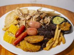 Base de papas a la francesa, carne de cerdo, 200 gramos, 2 morcillas,2 mazorcas, 2 chorizo coctel, 2 butifarras, 2 arepitas,2 patacones, guacamole, y hogao