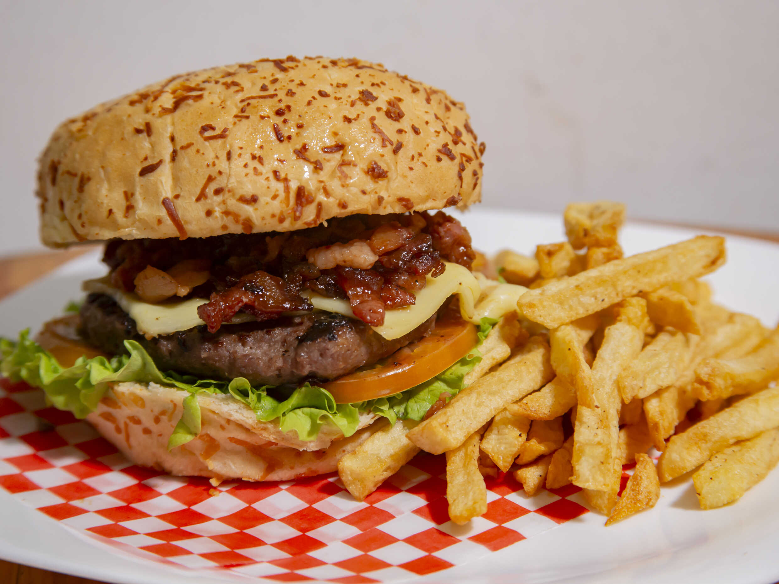 Pan, ketchup, lechuga, tomate, carne de res 120 gramos, queso mozarella, tocineta, 30 g de papas a la francesa, y mayonesa