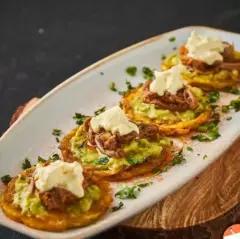 5 Mini patacones crocantes cubiertos con carne desmechada, queso, guacamole, y sour cream