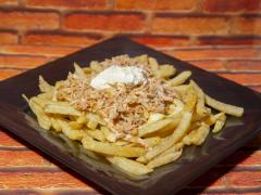 PAPAS 300 GR CON QUESO RALLADO, POLLO DESMECHADO 80 Y TOCINETA