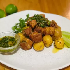 Exquisita combinacion de papa criolla, chicharron crocante 200 gr, bañado en chimichurri de ochuva