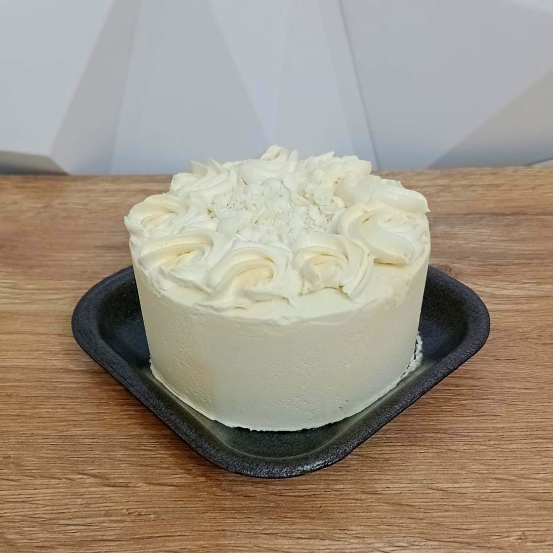 Suave y esponjoso bizcocho de vainilla natural, relleno de ganache de chocolate blanco, cubierto de la más rica y ligera butter cream.