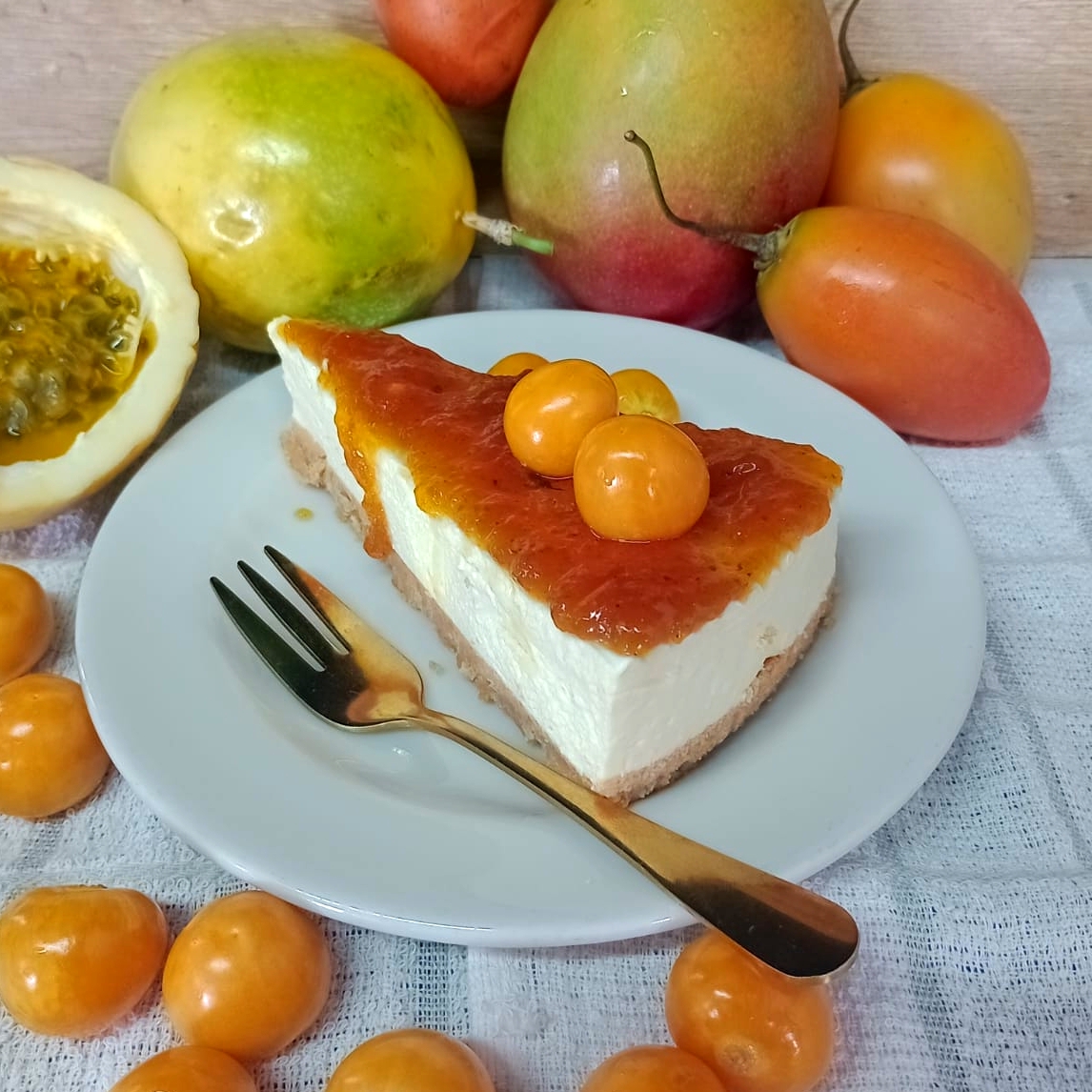 Riquísimo pastel de queso, con base de galletas, cubierto por la mas rica y natural mermelada artesanal de frutos amarillos.