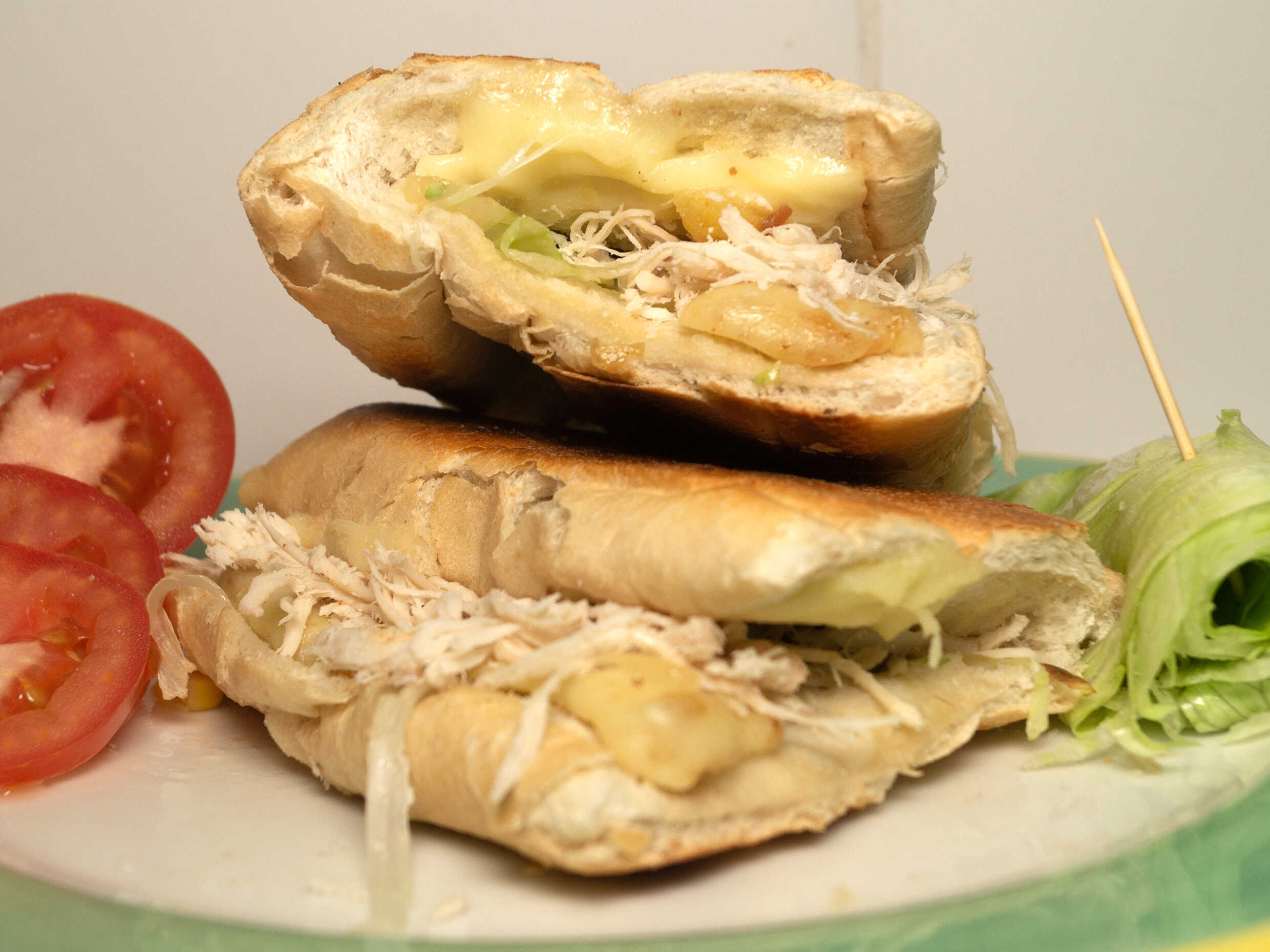 Jamón, pollo desmechado y tocineta, sándwich elaborado en pan francés, lechuga, queso mozzarella y salsa especial de ajo o si prefieres salsa rosada.