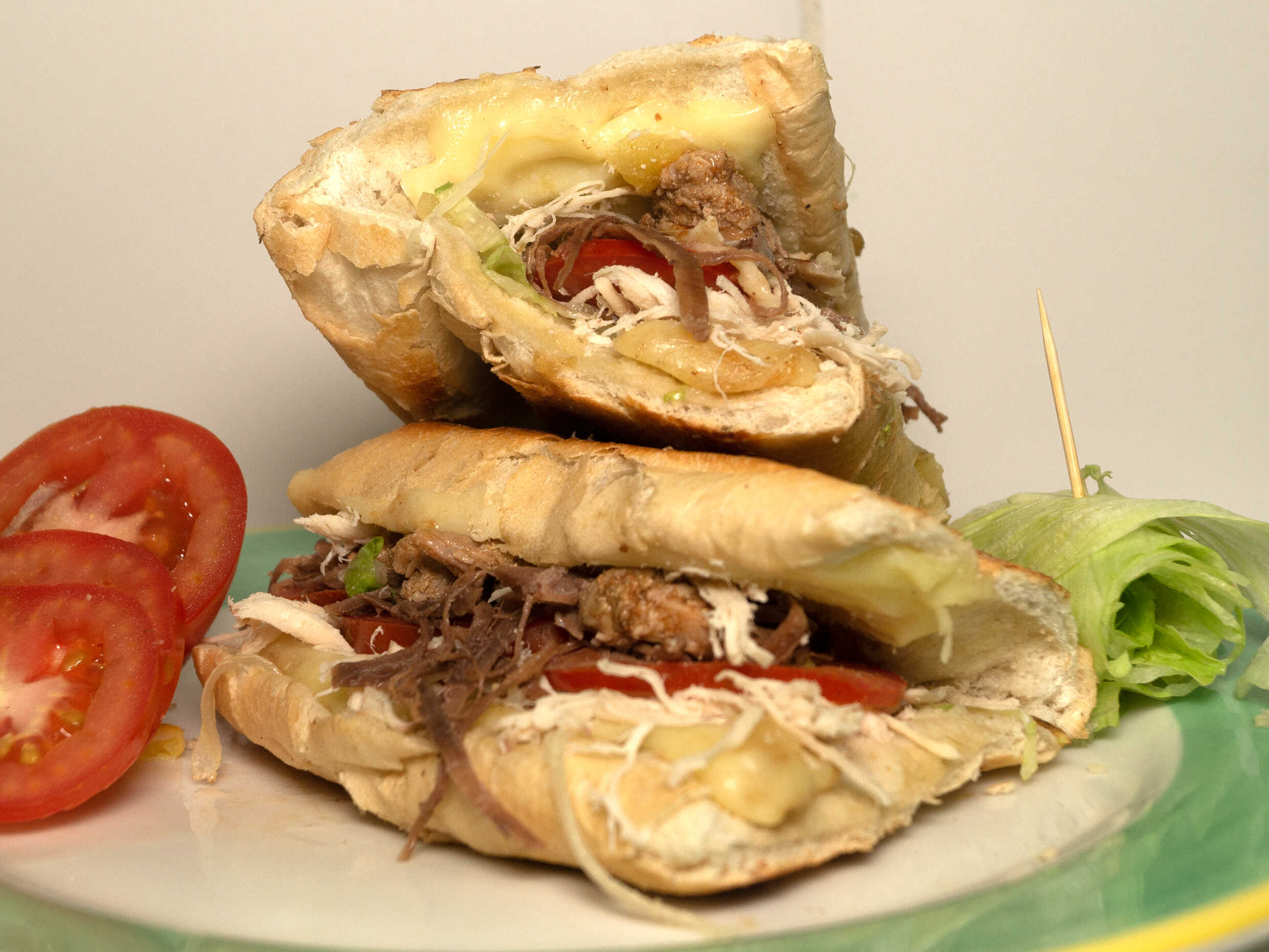 Carne de res desmechada, carne de cerdo en trozos, pollo desmechado, tomate, sándwich elaborado en pan francés, lechuga, queso mozzarella y salsa especial de ajo o si prefieres salsa rosada.