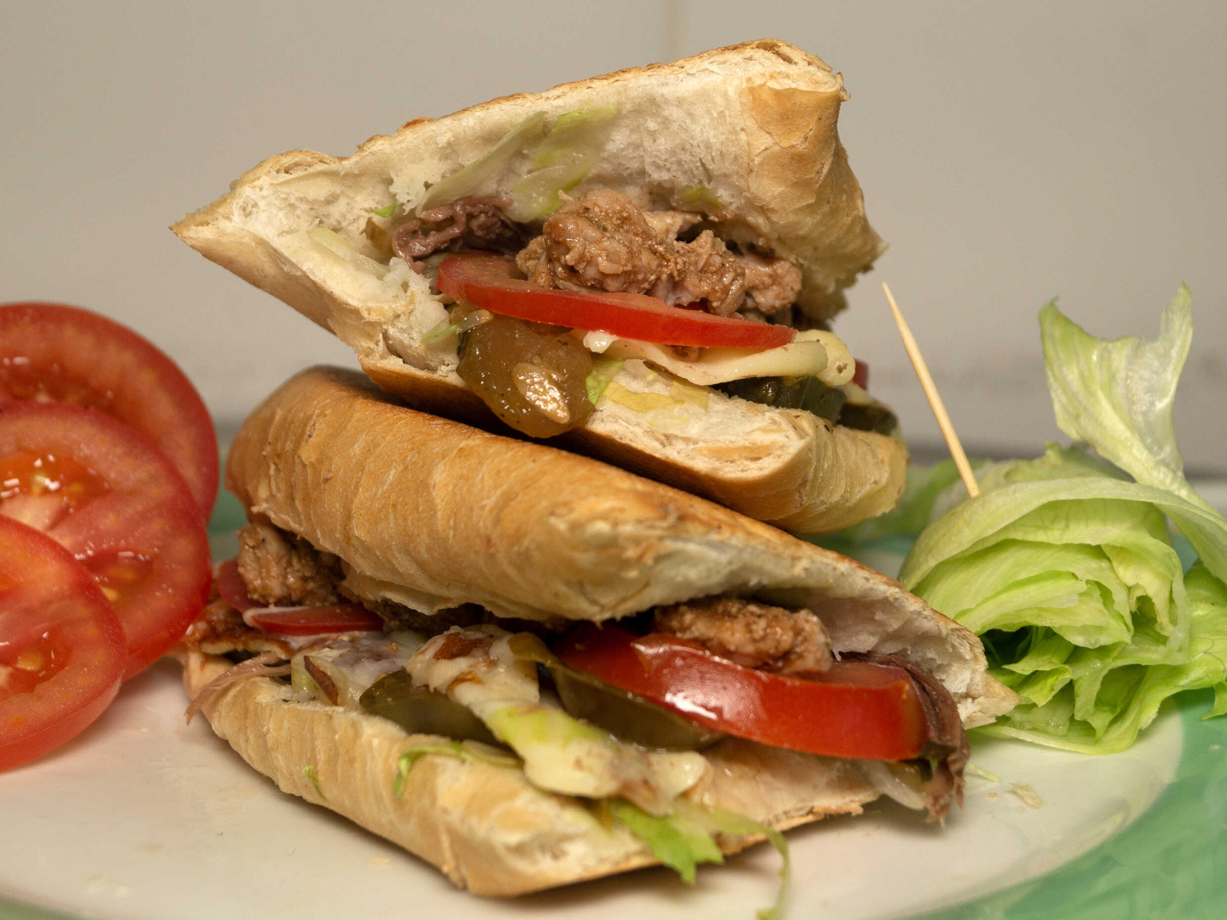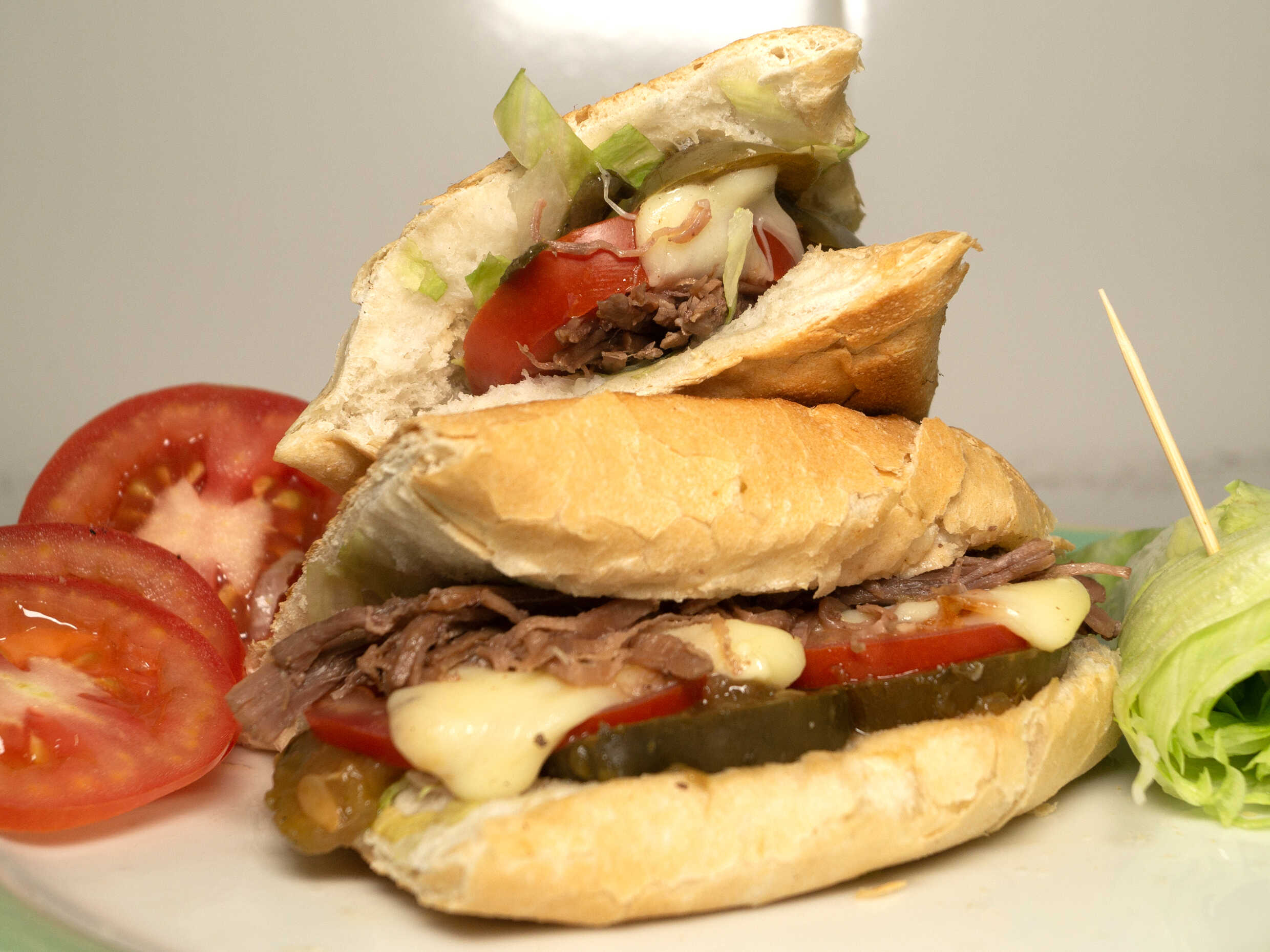 Carne desmechada, pepinos agridulces, tomate, sándwich elaborado en pan francés, lechuga, queso mozzarella y salsa especial de ajo o si prefieres salsa rosada.