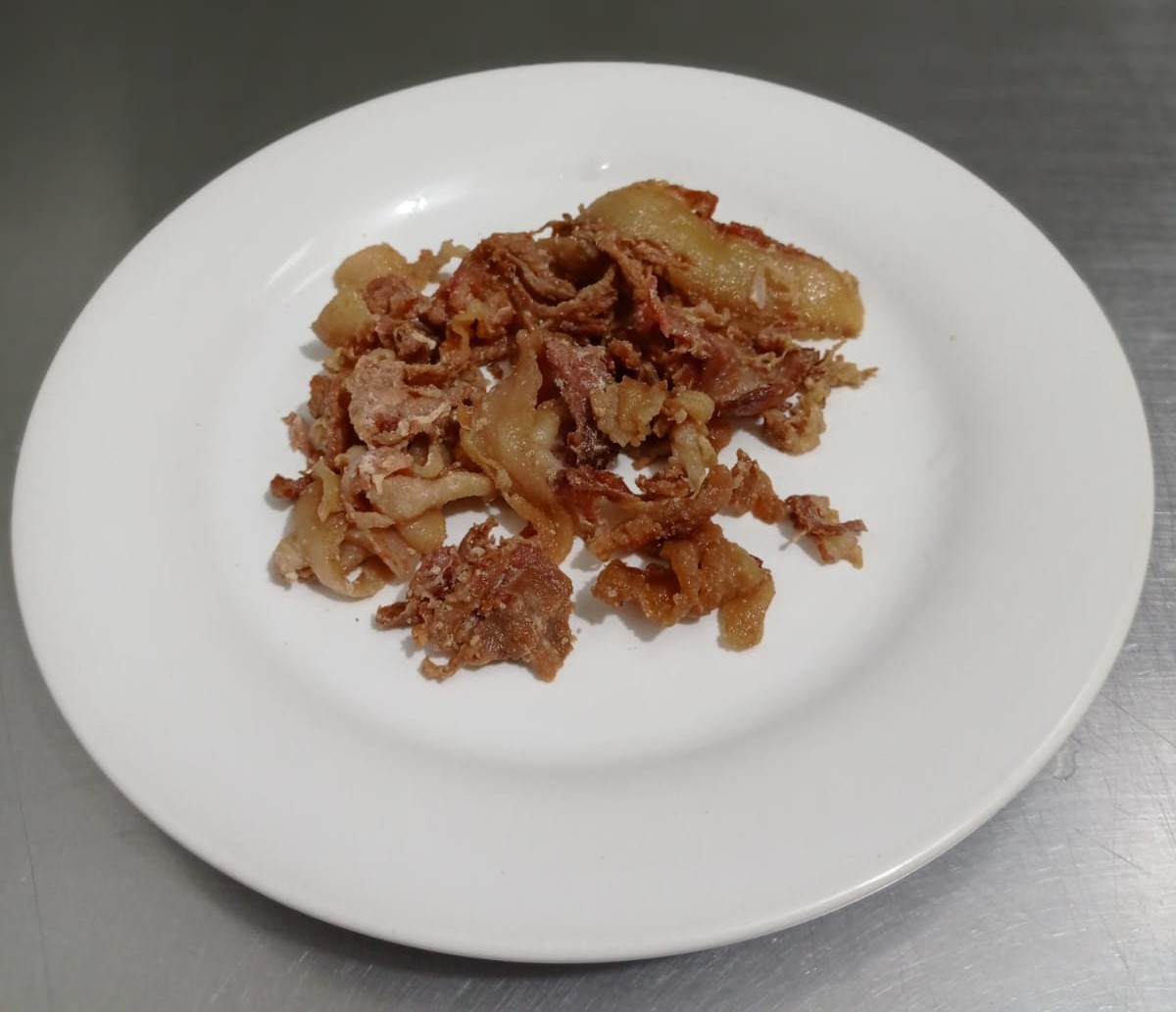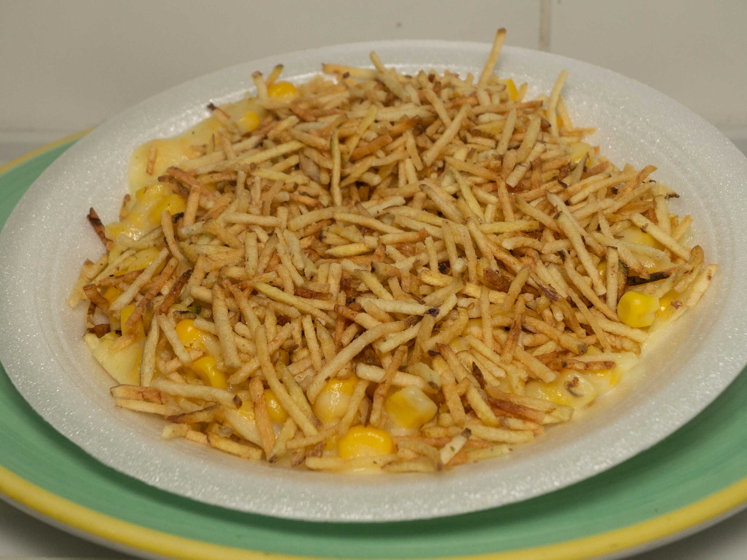 Maíz dulce en salsa showy, sour cream, queso mozzarella, tocineta, ripio de papa, pollo desmechado y mermelada de piña.