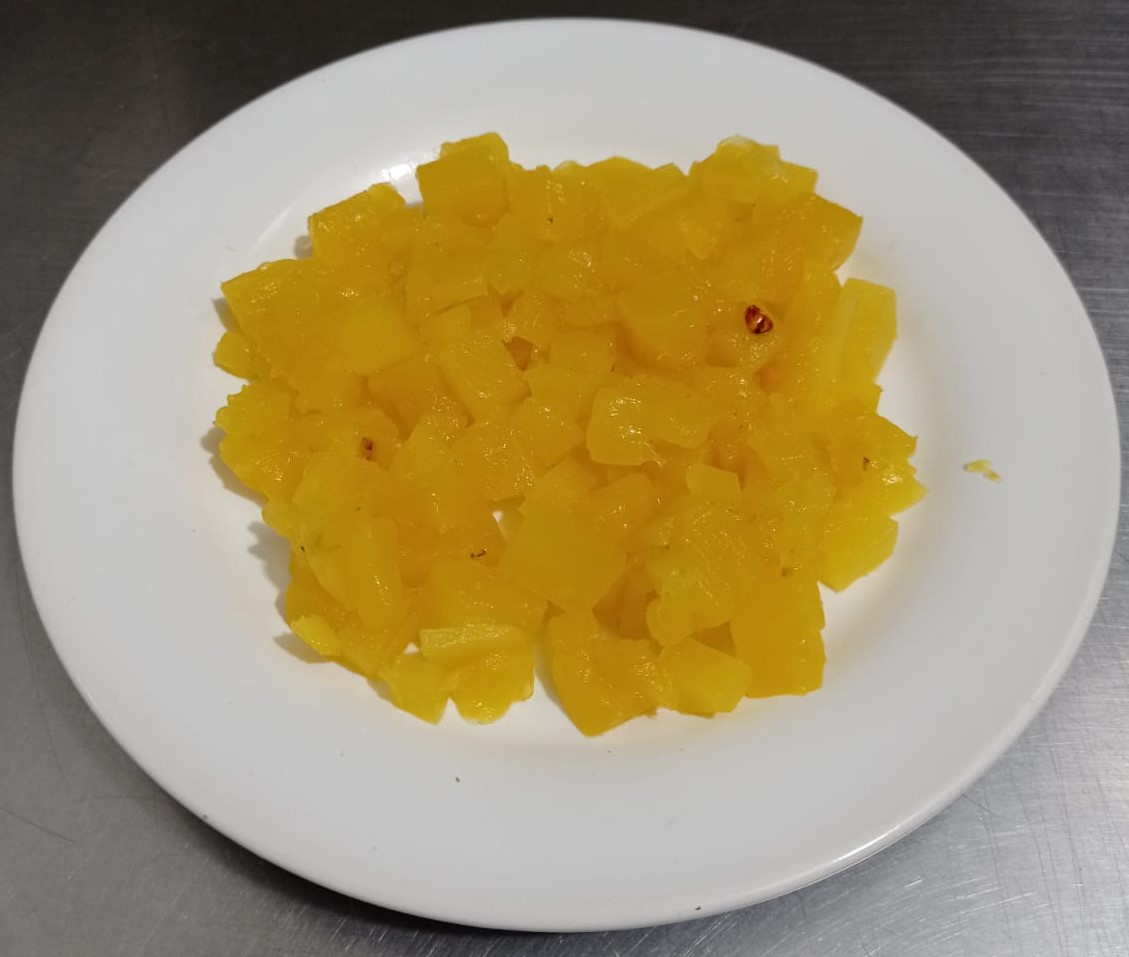Maíz dulce en salsa showy, sour cream, queso mozzarella, ripio de papa y mermelada de piña.