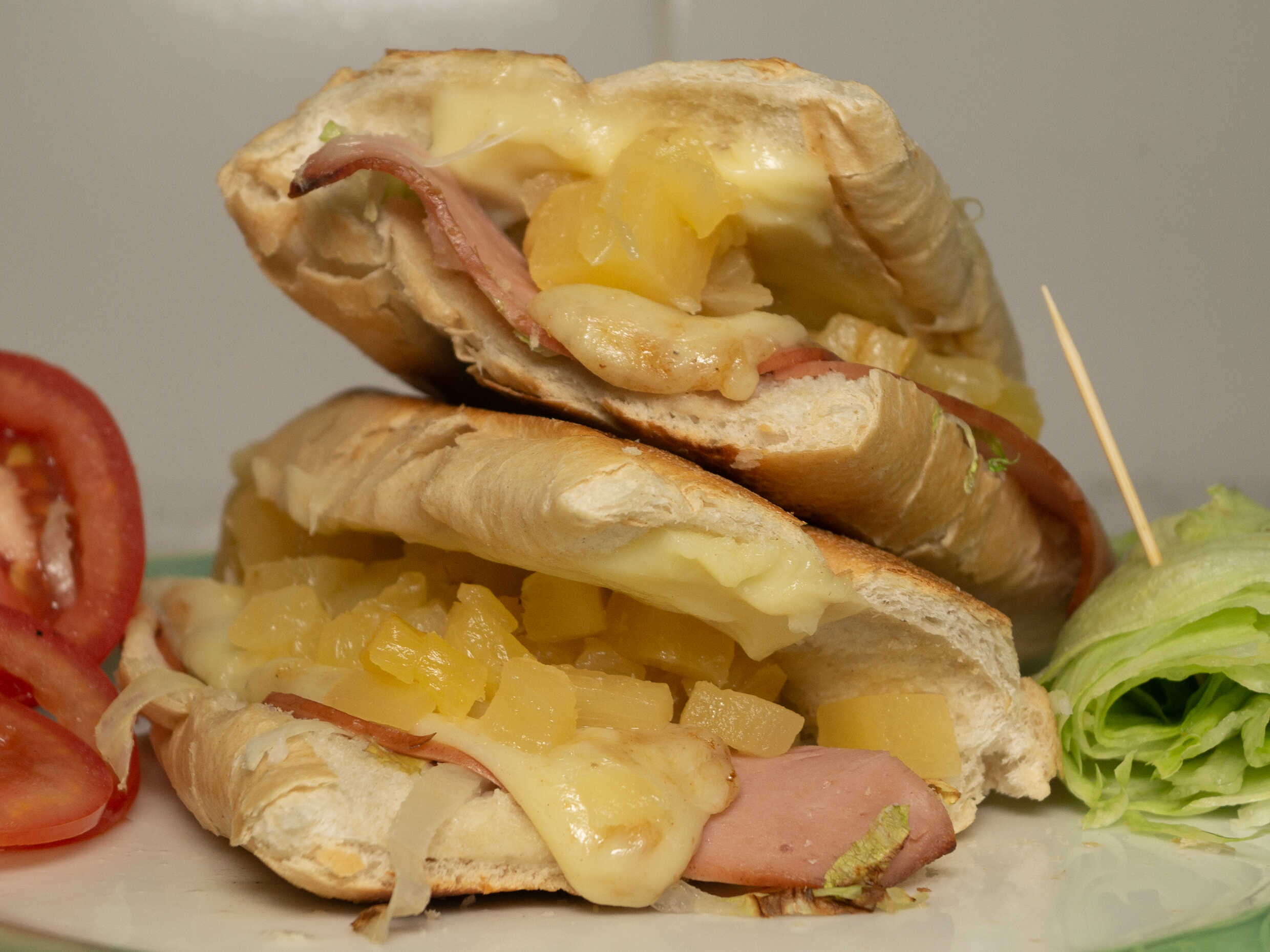 Jamón y piña en trozos, sándwich elaborado en pan francés, lechuga, queso mozzarella y salsa especial de ajo o si prefieres salsa rosada.