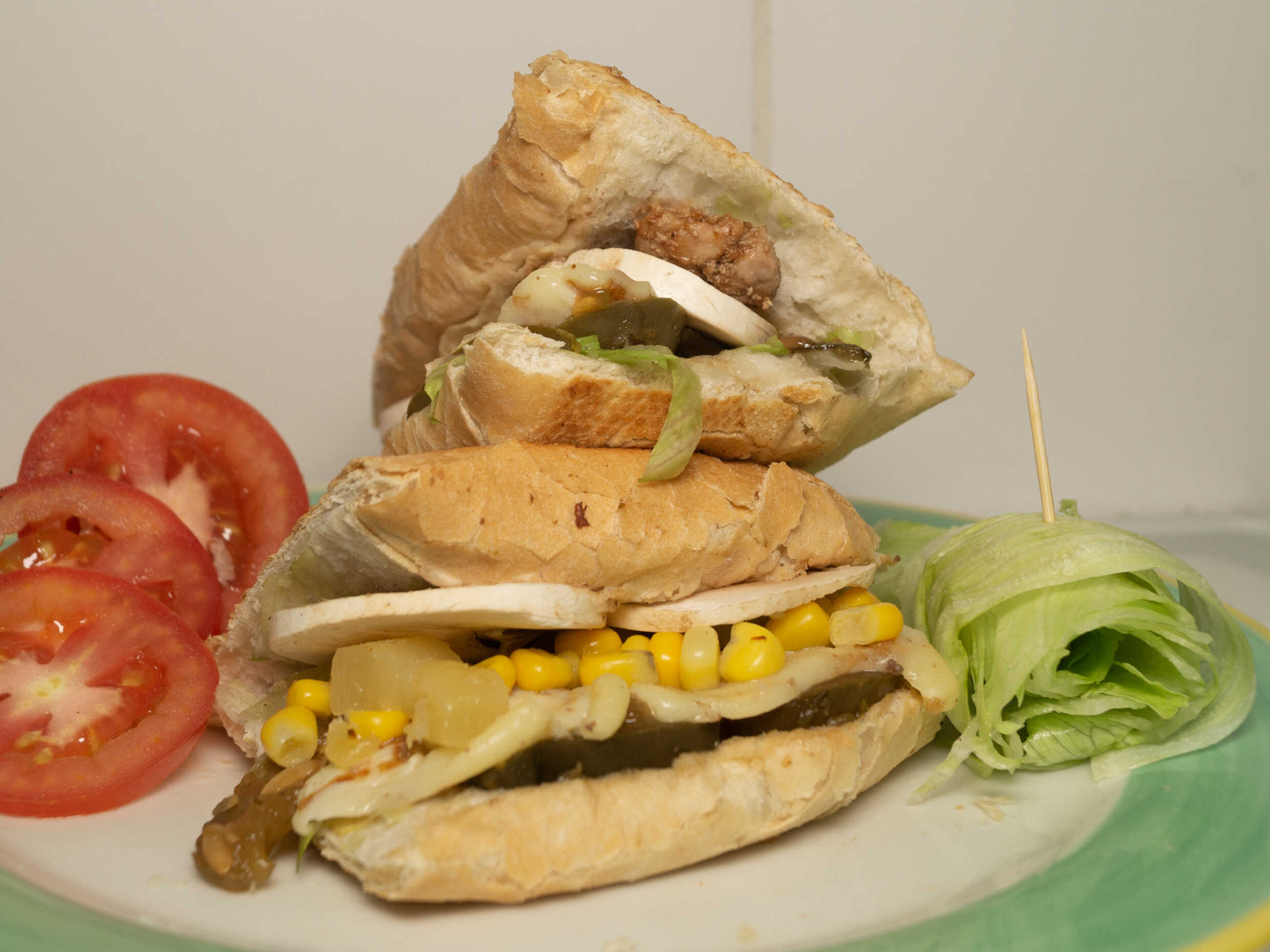 Pepinos agridulces, piña, maíz, champiñones, sándwich elaborado en pan francés, lechuga, queso mozzarella y salsa especial de ajo o si prefieres salsa rosada.