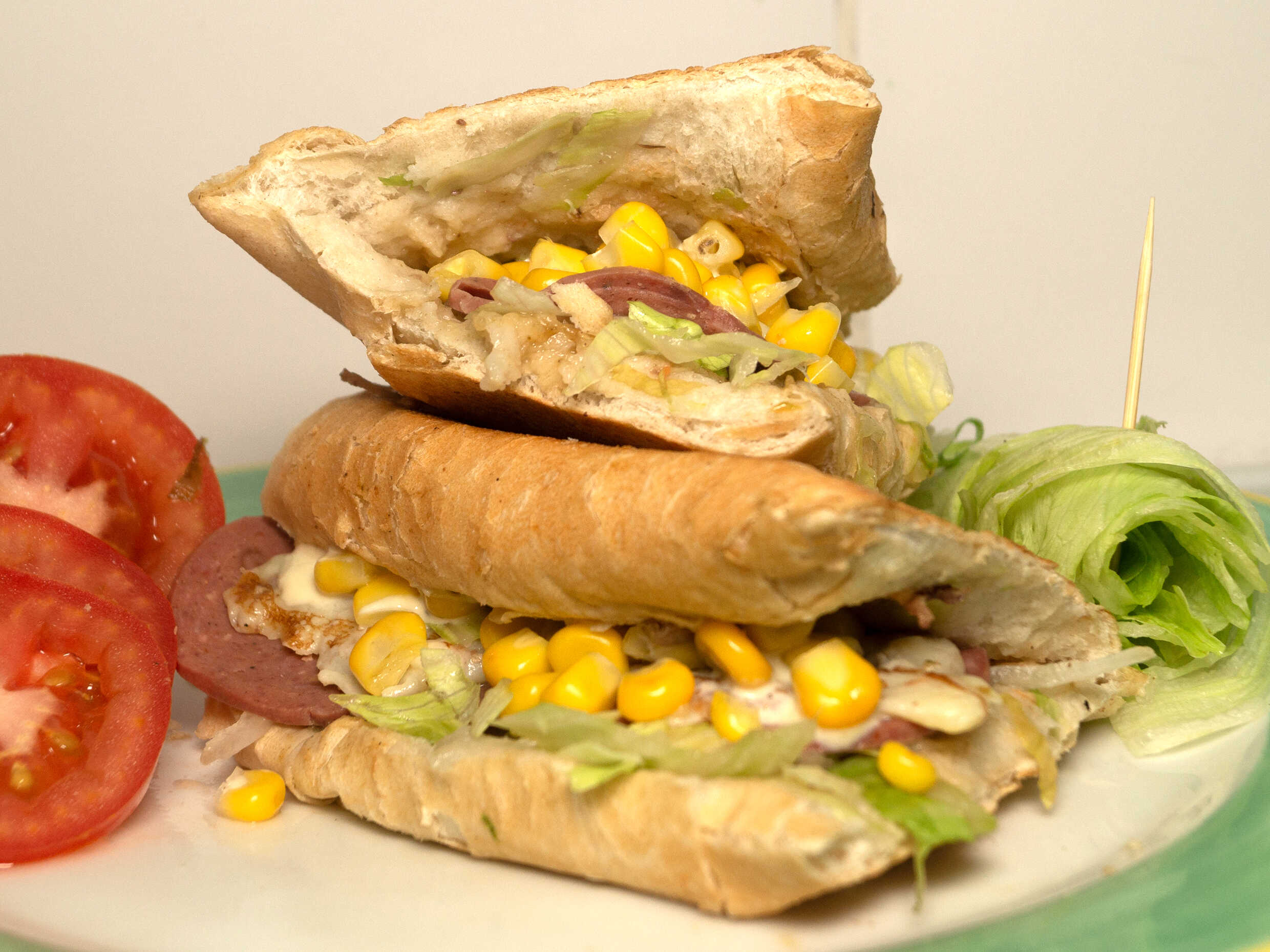 Maicitos y salami, sándwich elaborado en pan francés, lechuga, queso mozzarella y salsa especial de ajo o si prefieres salsa rosada.