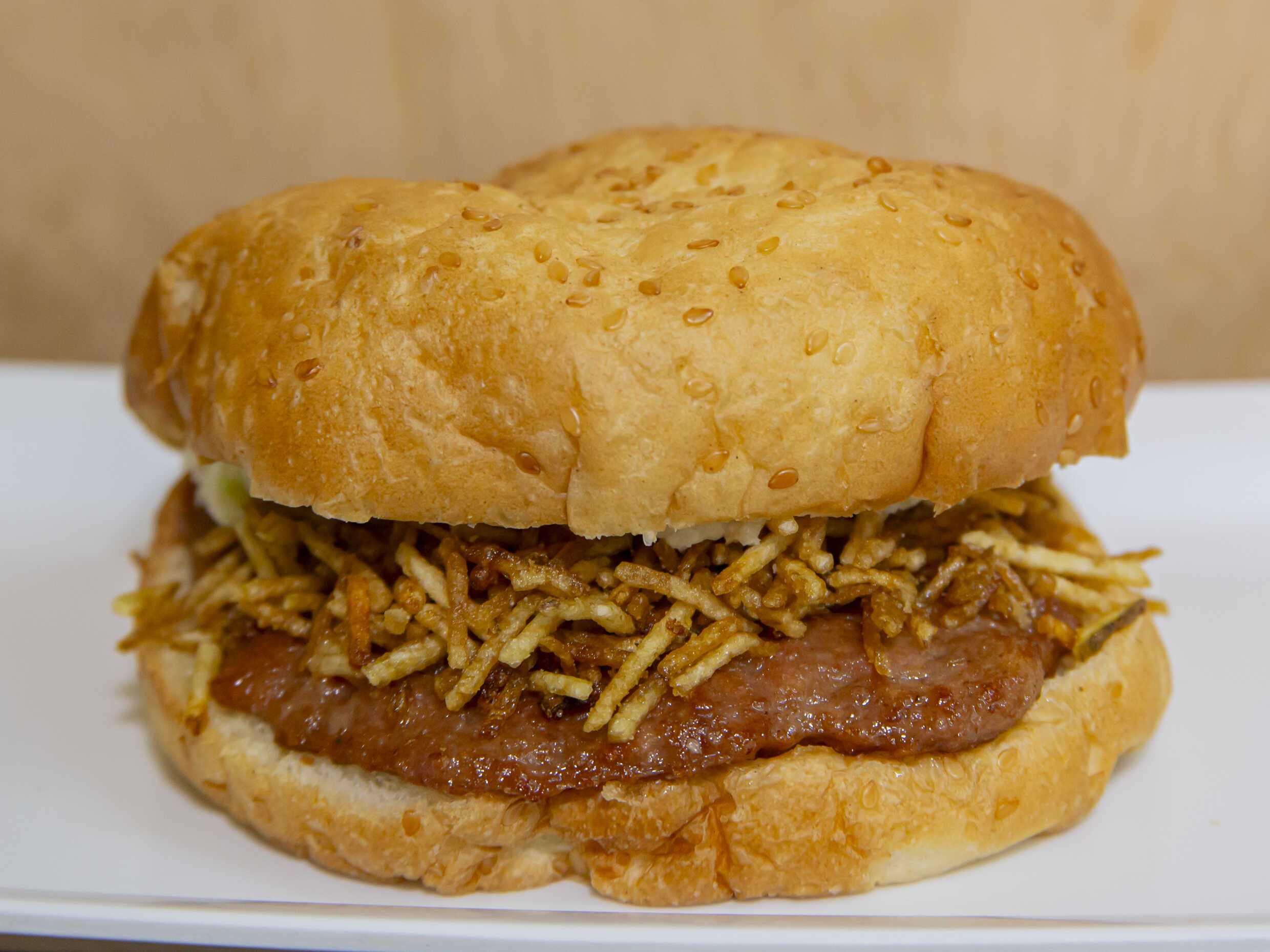 Pan artesanal, carne, ripio de papa y ensalada, queso o tocineta.