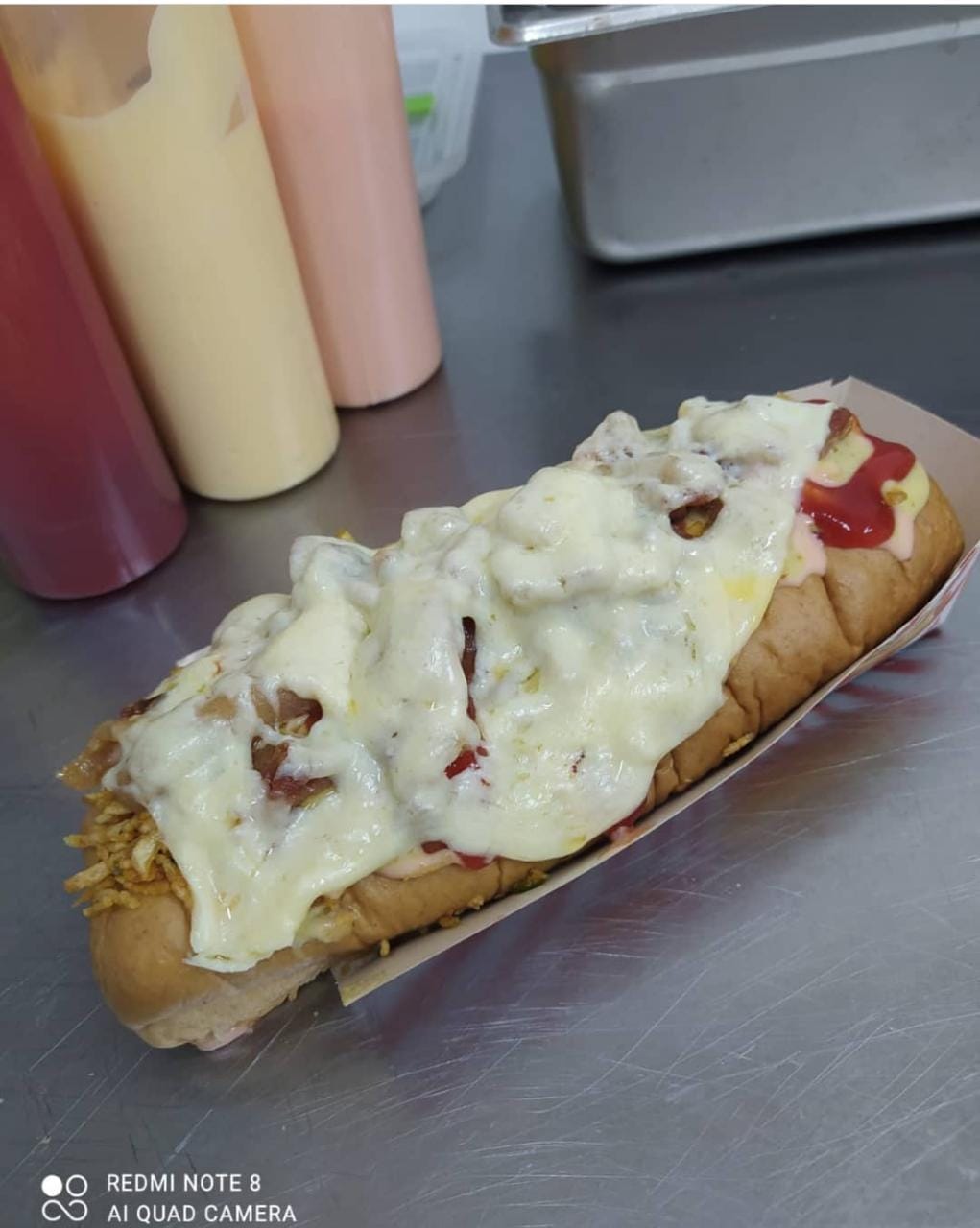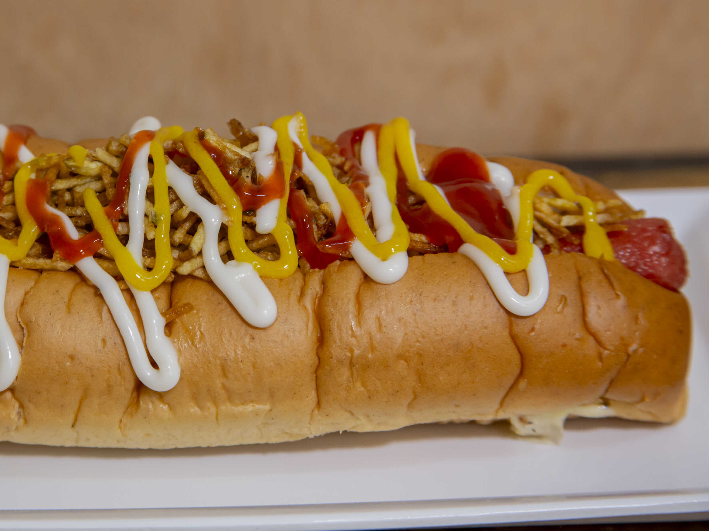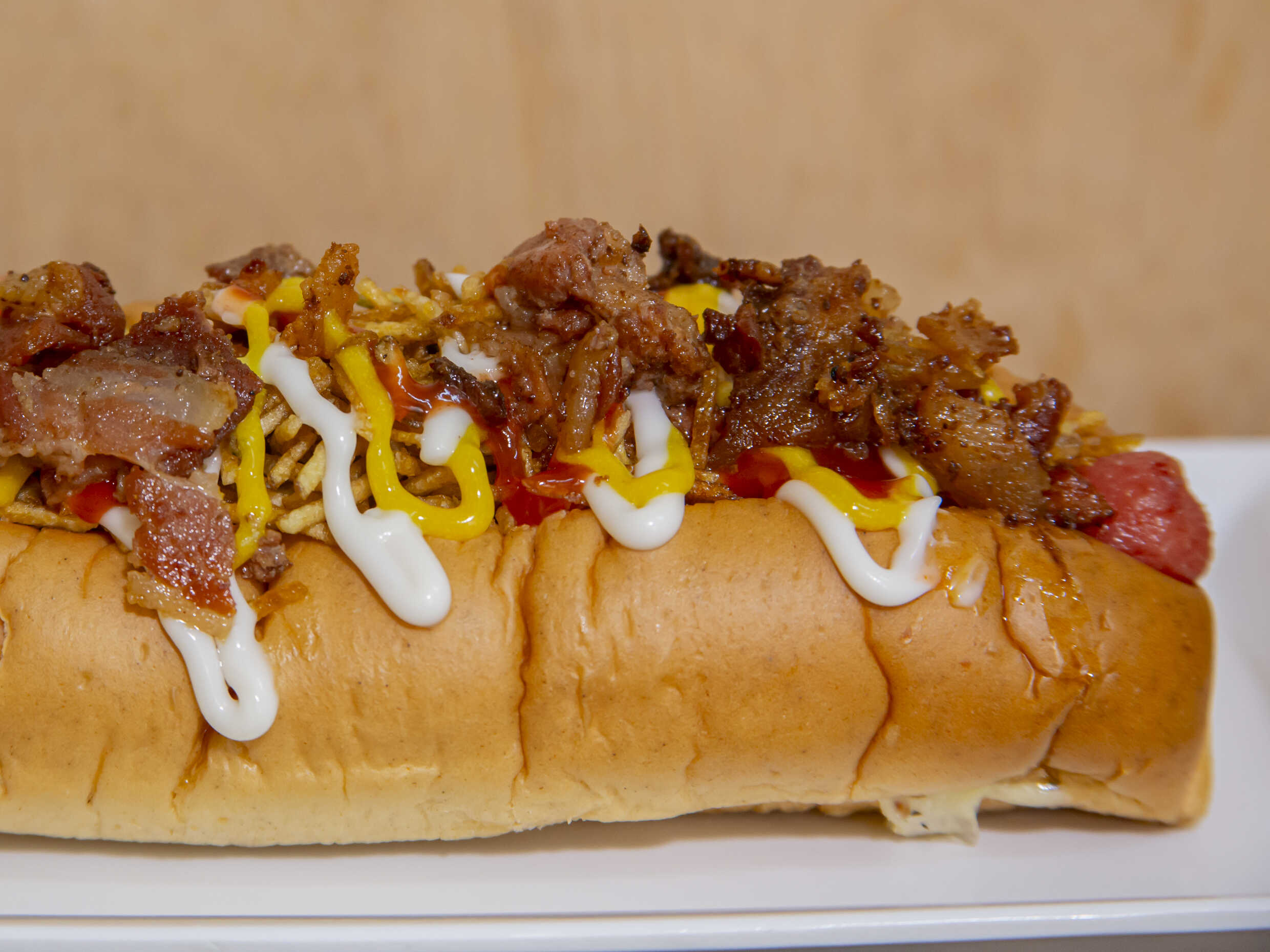 Pan artesanal, ripio de papa y ensalada, doble salchicha, tres queso y tres tocineta.