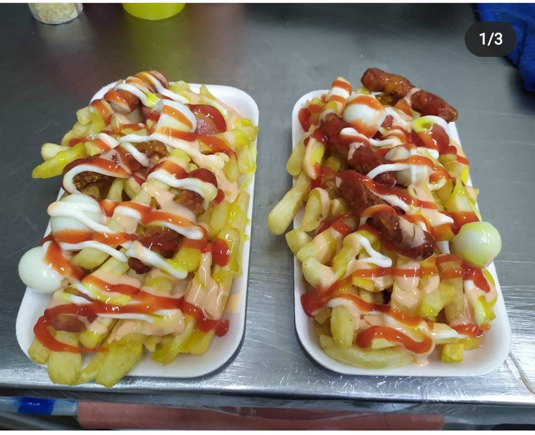 Pan artesanal, salchicha, ripio de papa y ensalada, queso y tocineta, Salchipapa Sencilla (Papas a la francesa acompañadas con salchicha, 1 huevo y salsas de la casa).