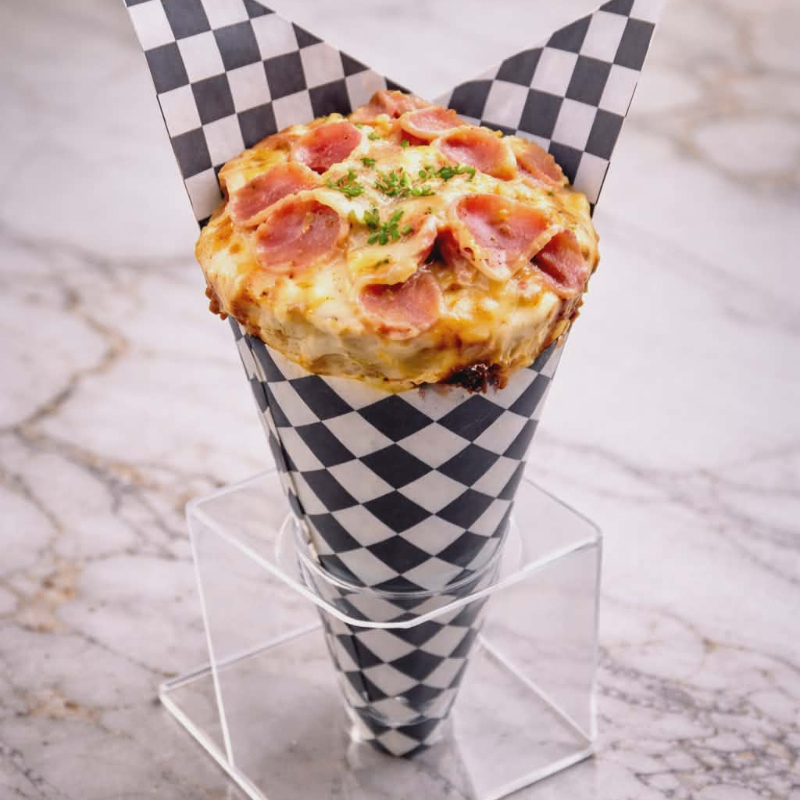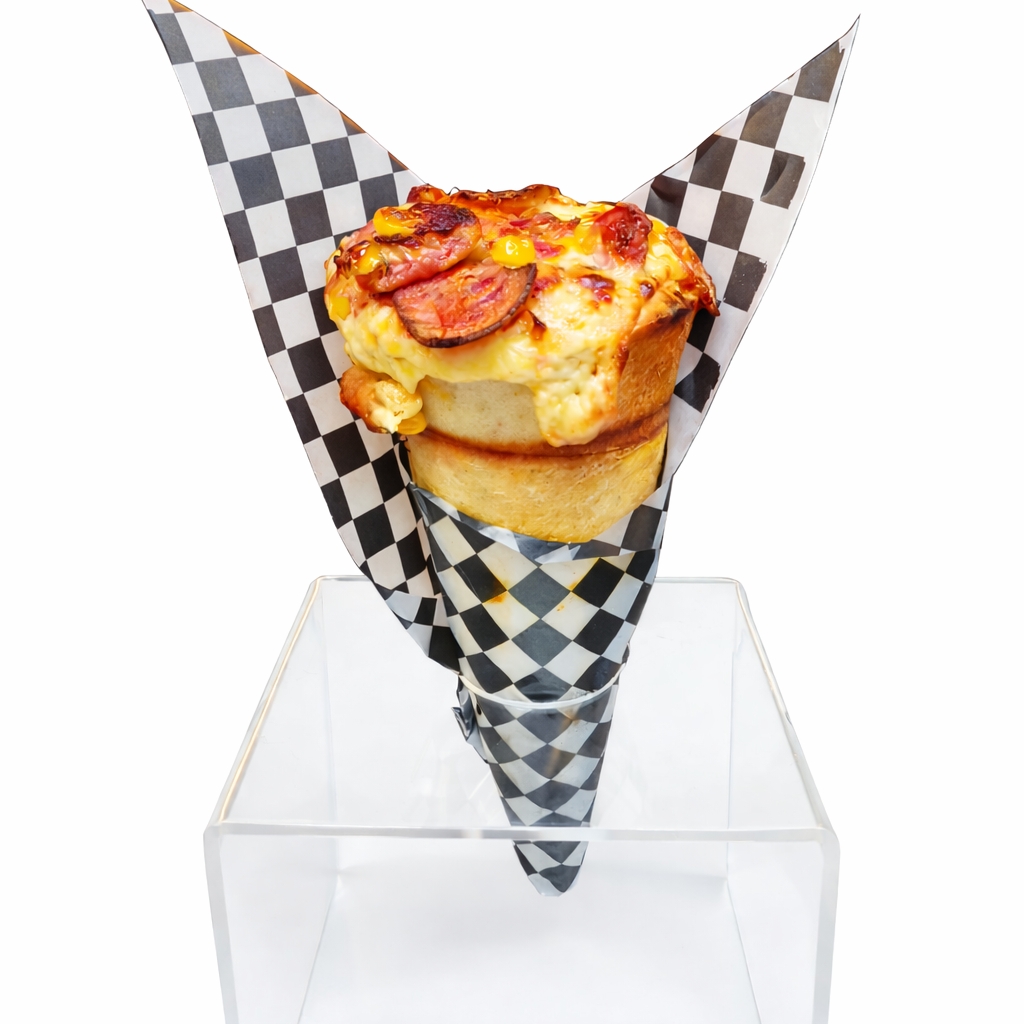 pizza cono rancherito ( salchicha ranchera, jamón, maíz)