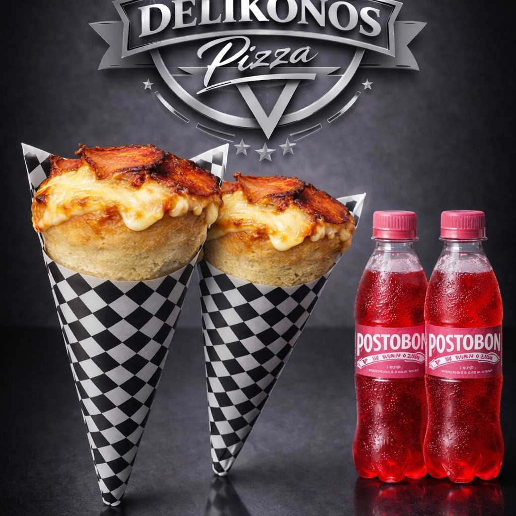 2 pizza cono charcutero ( tocineta, jamón, pepperoni) acompañado de 2 Postobón 250ml