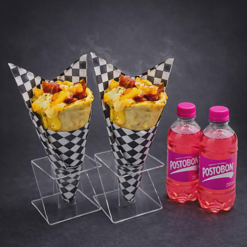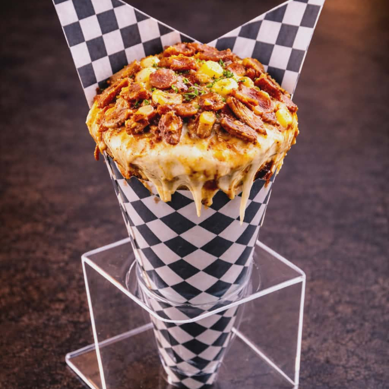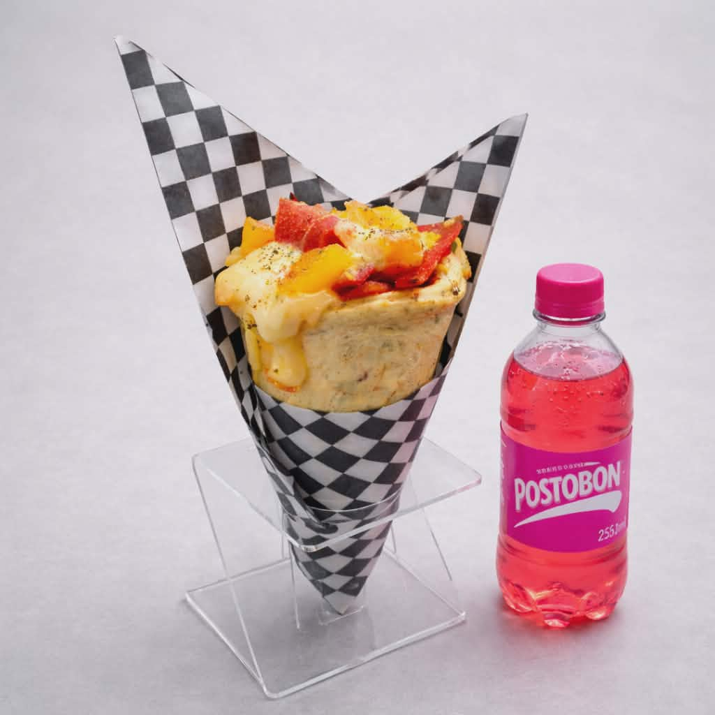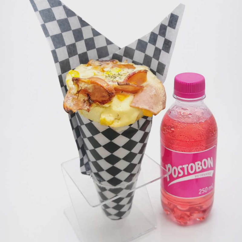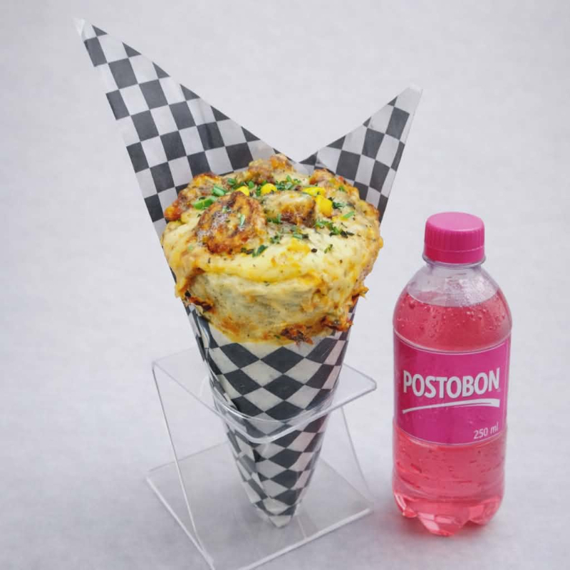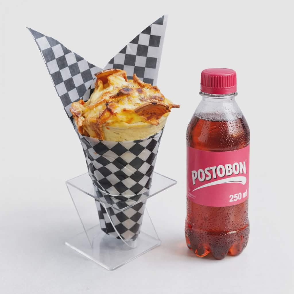 cono de pizza relleno de chicharro carnudo. chorizo de ternera. maiz , doble queso mozarela y salsa de la casa acompañado de 1 Postobón 250ml