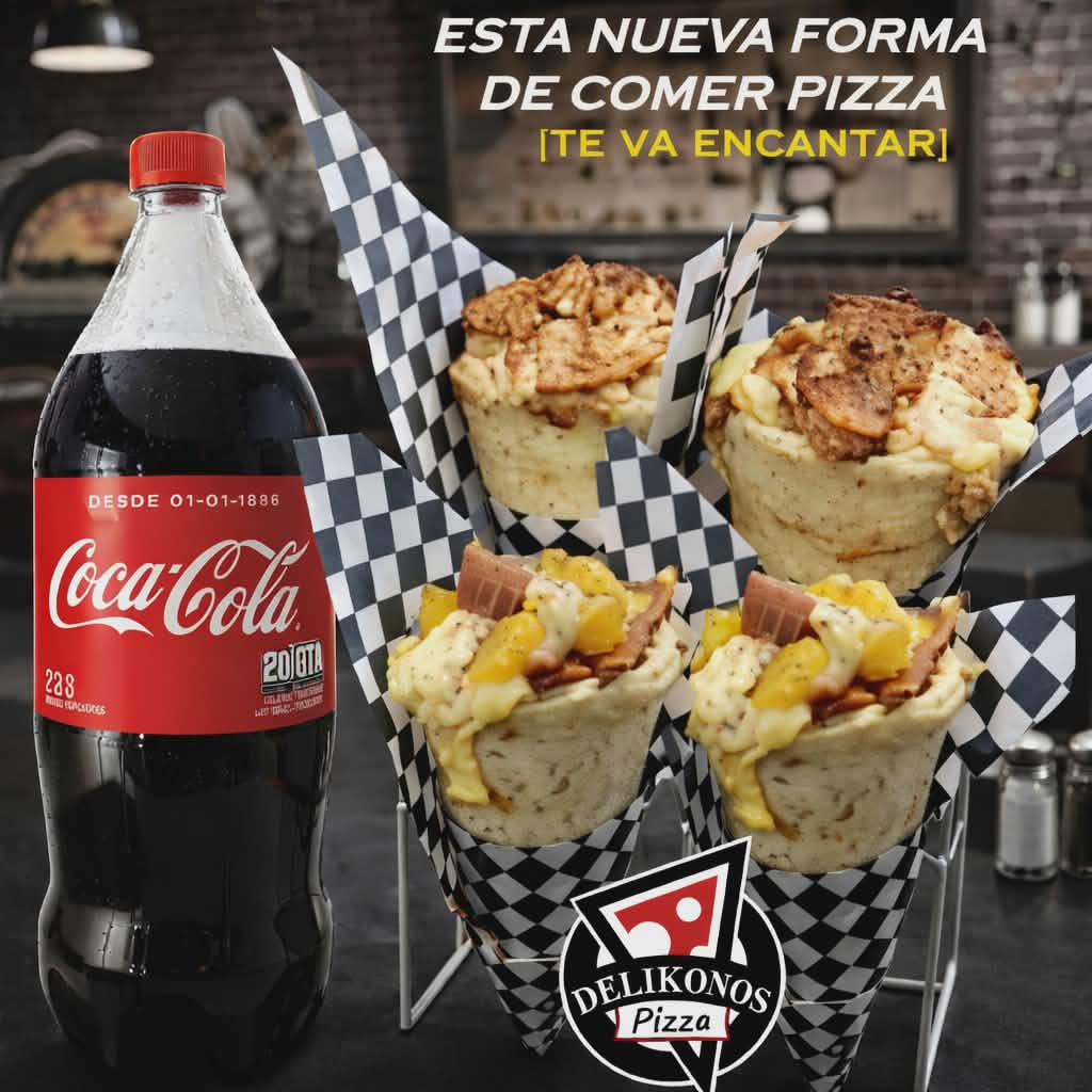 dos conos de pizza rellenos con doble queso mozarella, carne desmechada,pollo desmechado, tocineta, salsas de la casa, acompañado de dos gaseosas coca cola 250ml
