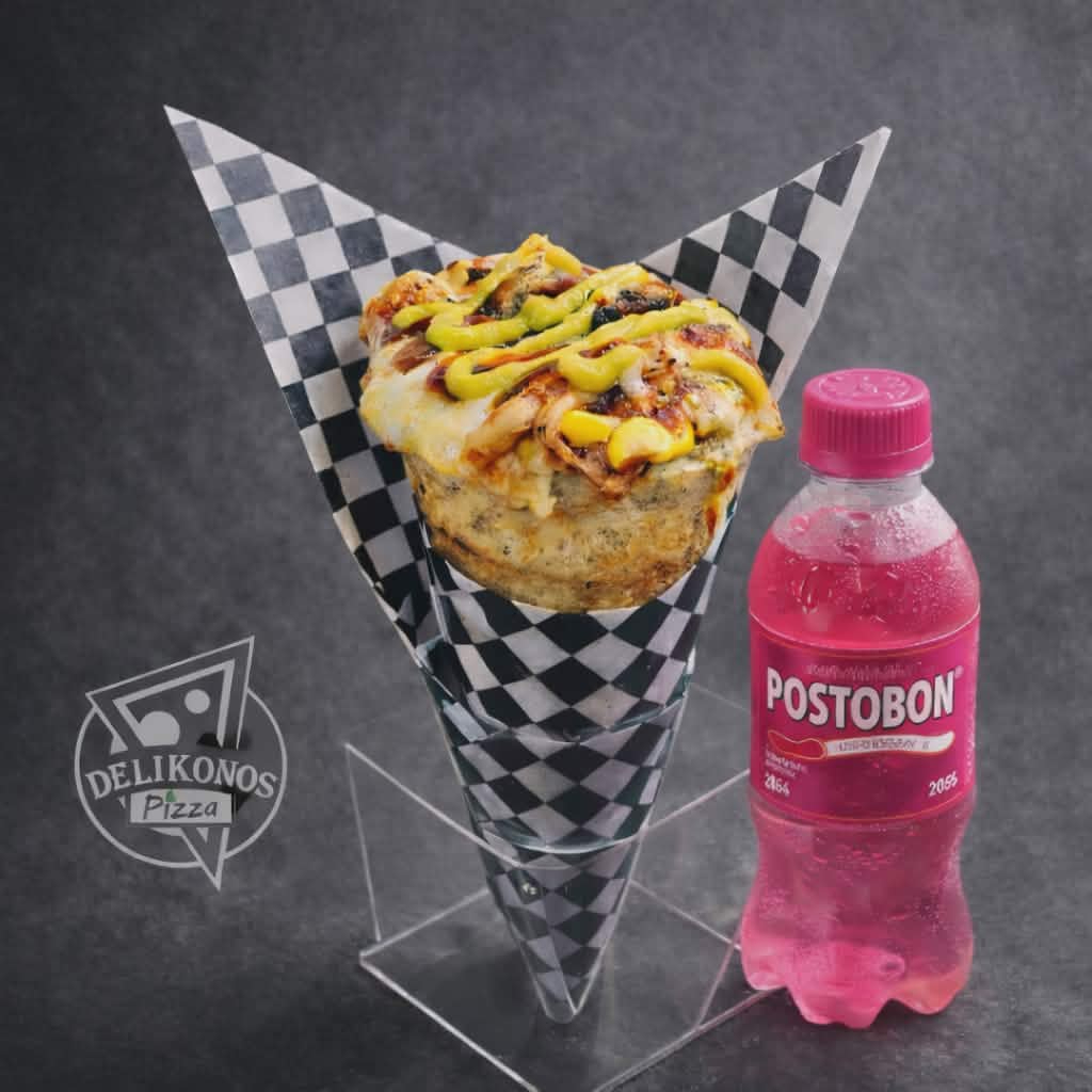 kono de pizza relleno de salchicha ranchera, jamon, maiz, doble queso mozarela y salsa de la casa acompañado de Postobón 250ml