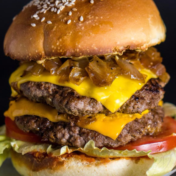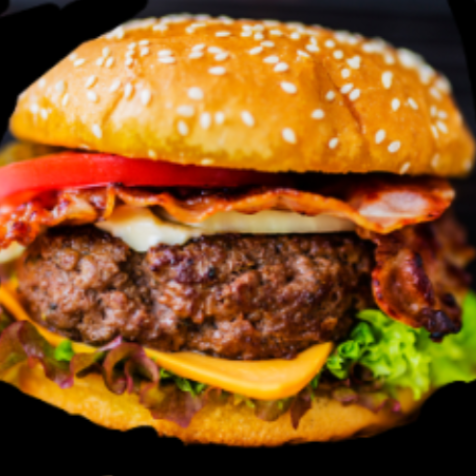 Doble carne a la parrilla, tocineta, queso, Tomate , Lechuga Cebolla y Salsas