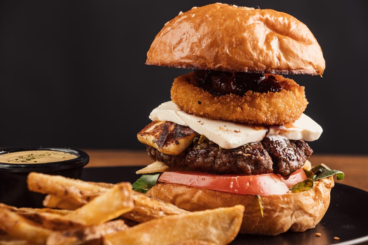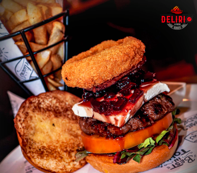 Pan tipo brioche sellado en mantequilla, mix de lechugas, tomate, mayonesa de la casa, carne artesanal de la casa, queso papialpa asado, queso philadelphia, mermelada de trozos de tocino con arándanos y frutos rojos en reducción de vino tinto, finalizado con aro de cebolla en tempura japonesa. Acompañada de papas a la francesa