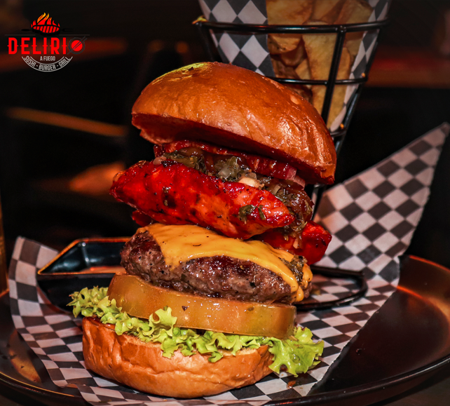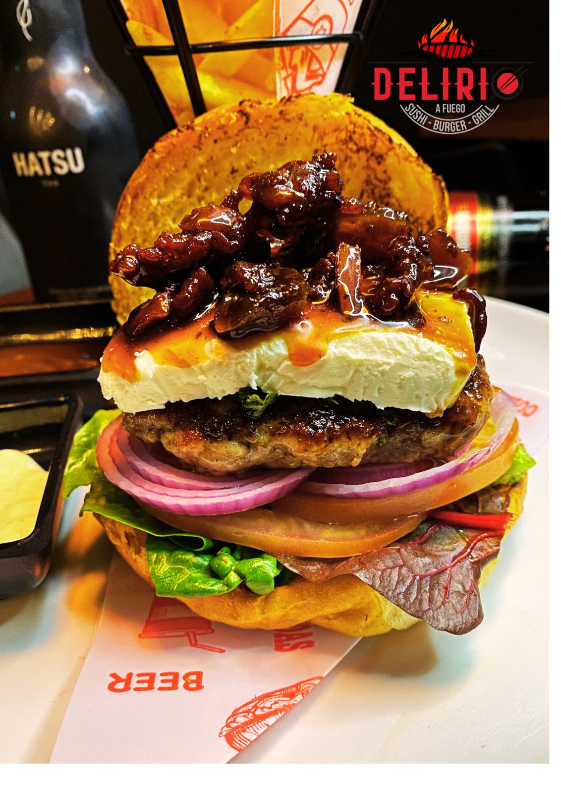 pan artesanal tipo brioche de origen frances, 150 gr de carne de la casa 100% res, langostino freco marinado, apanado con tempura japonesa, mayo siracha, salsa teriyaki, ajomjoli, queso mozzarella, mezlum y tomate. Acompañada de papas a elección.