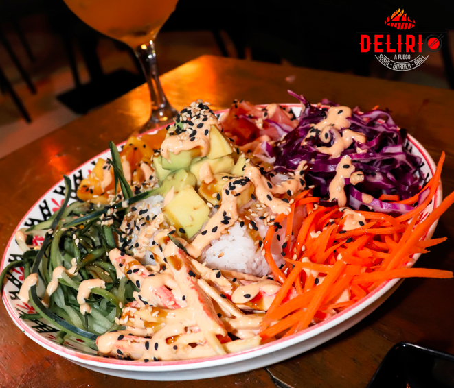 Arroz de sushi, Salmon fresco, palmito de cangrejo, juliana de zanahoria, fideo de pepino, cubos de mango, cubos de aguacate, juliana de repollo morado, mix de ajonjoli, salsa teriyaki y mayo siracha.