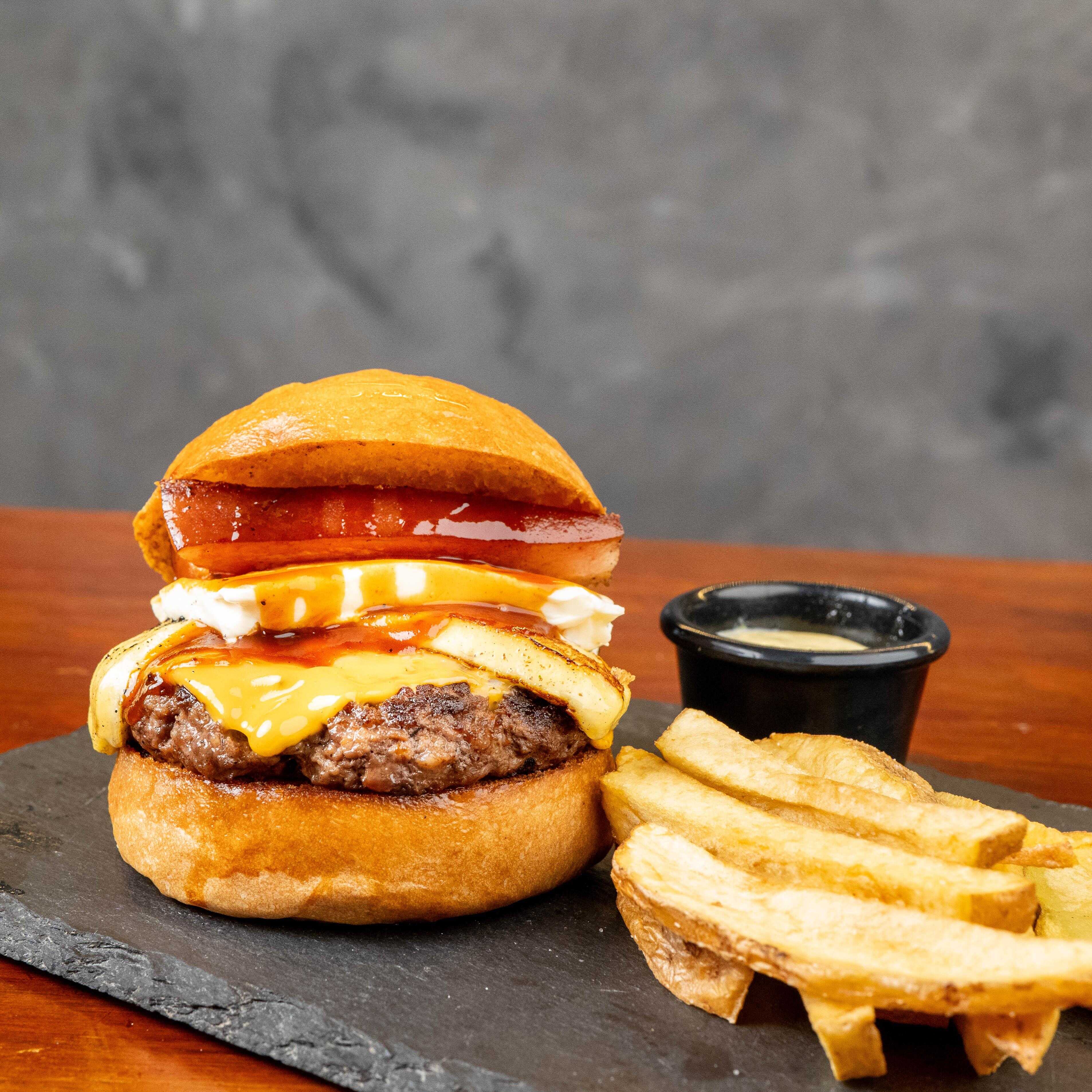 Pan artesanal tipo brioche de origen francés, 150 g de carne de la casa 100% res, panceta ahumada bañada en BBQ de tamarindo, queso papialpa asado, queso americano, queso philadelphia. Acompañada de papas a elección.
