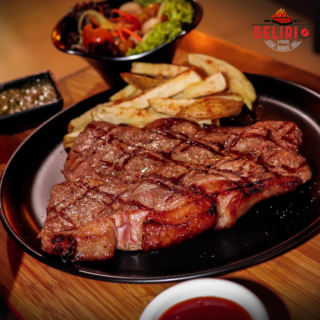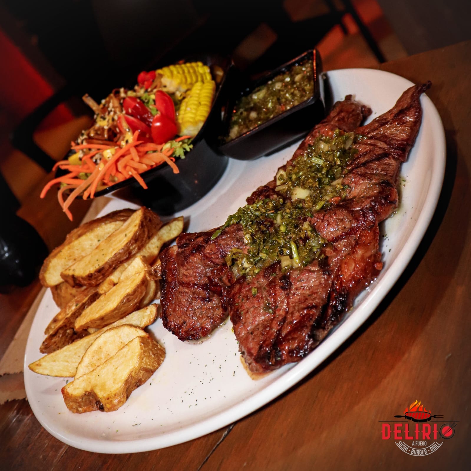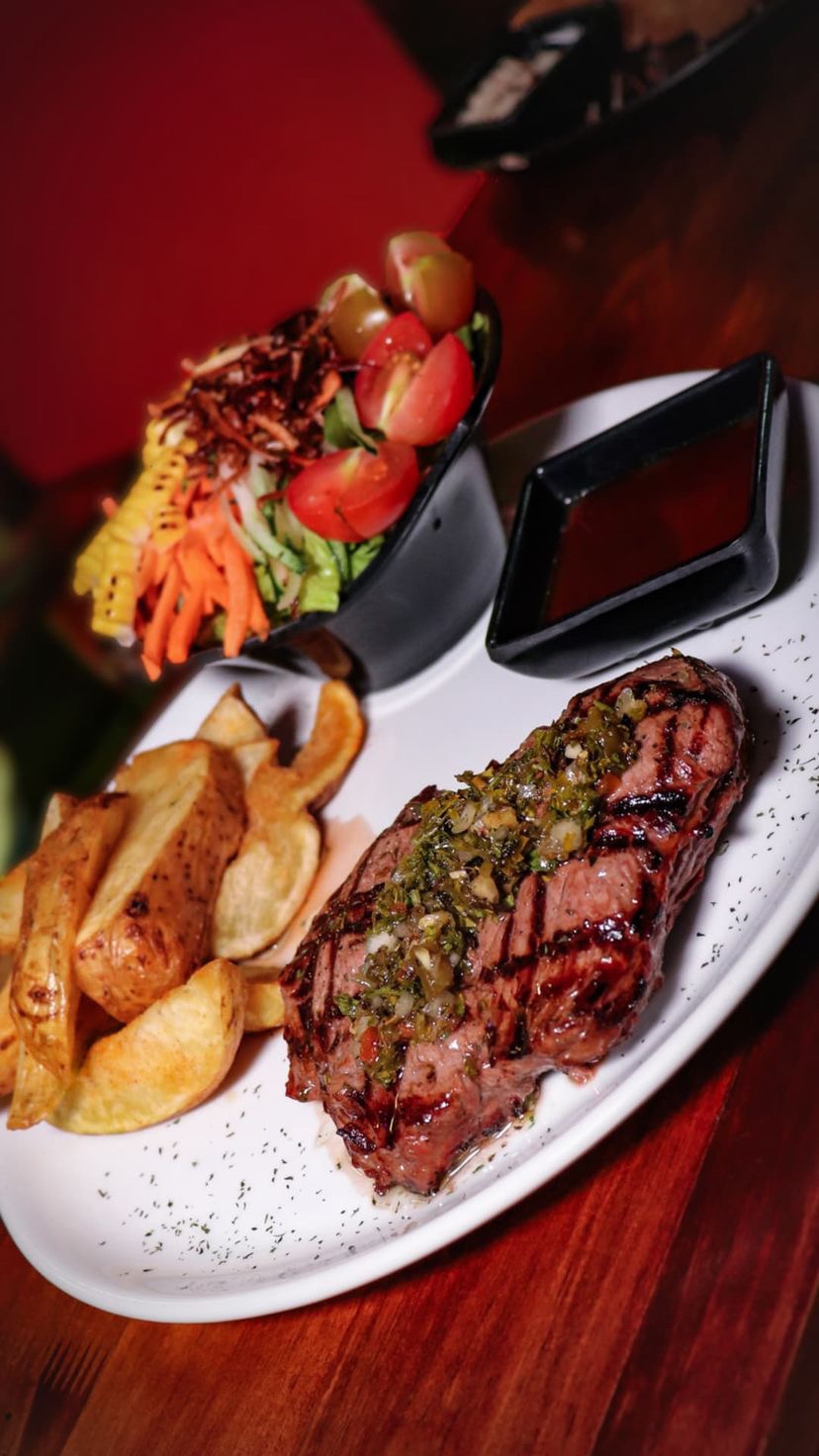 300 g De filete de churrasco, bañado en chimichurri, acompañado de papas a elección y ensalada especial de la casa.