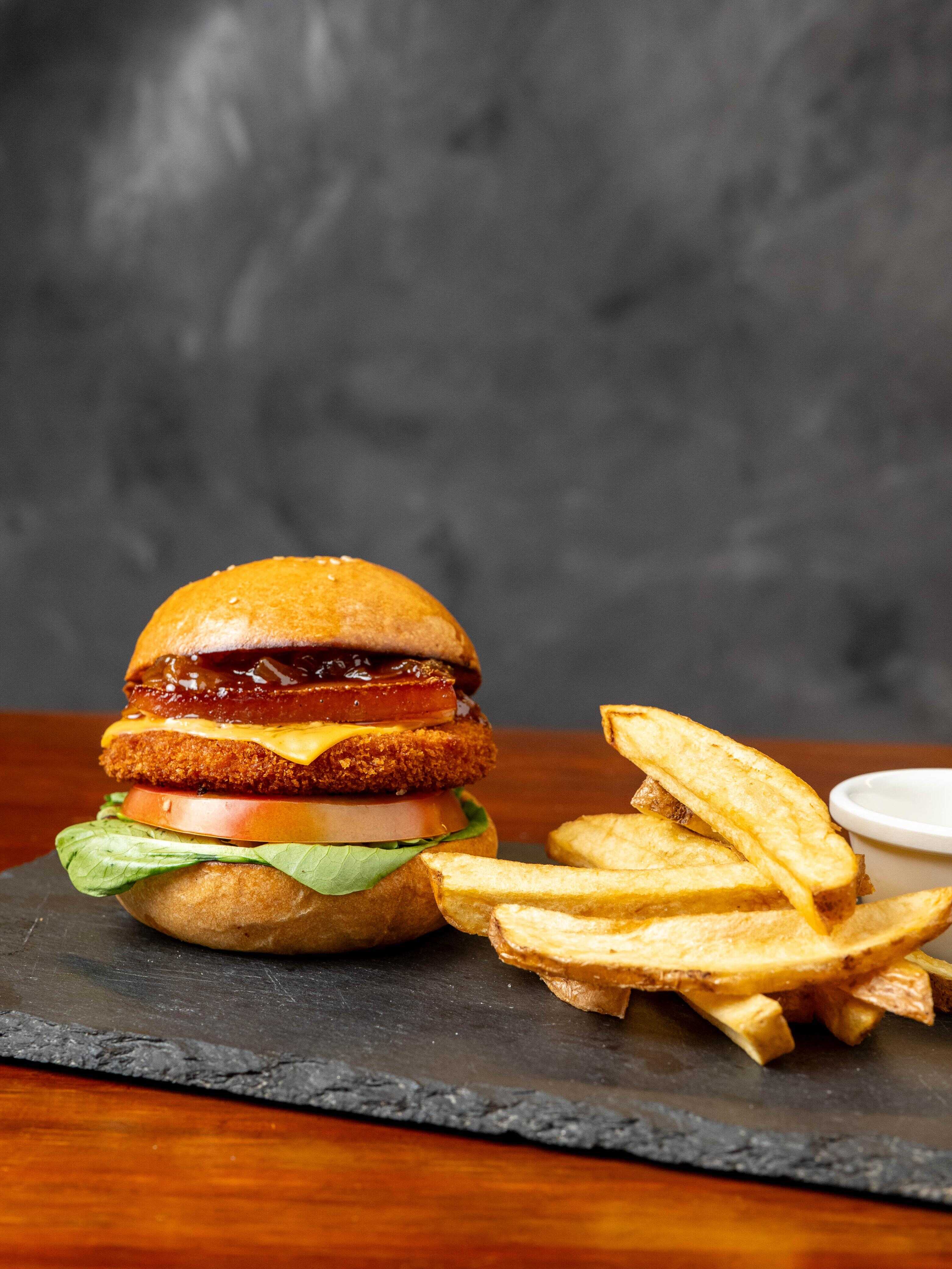 Pan artesanal tipo brioche de origen frances, 150 gr de carne de hamburguesa de la casa 100% cerdo, cubierta de queso philadelphia y chicharron caramelizado en BBQ de tamarindo, mezclum, tomate y aro de cebolla con tempura de cerveza. Acompañada de papas a elección.