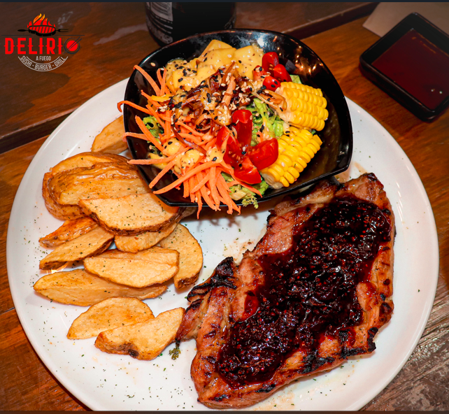 300 gr. de Bondiola de cerdo madurada, bañada en reducción de chipotle y frutos rojos. Acompañada de ensalada especial de la casa, papas a elección.