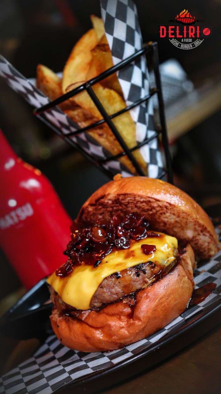 Pan artesanal tipo brioche de origen francés, 150 g de carne de la casa 100% res, queso americano, chorizo relleno de la panceta ahumada, cebolla caramelizada, tomate y lechuga. Acompañada de papas a elección.