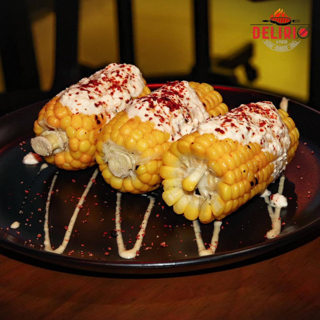 Mazorca a la parrilla, bañado en sour cream y tajín.