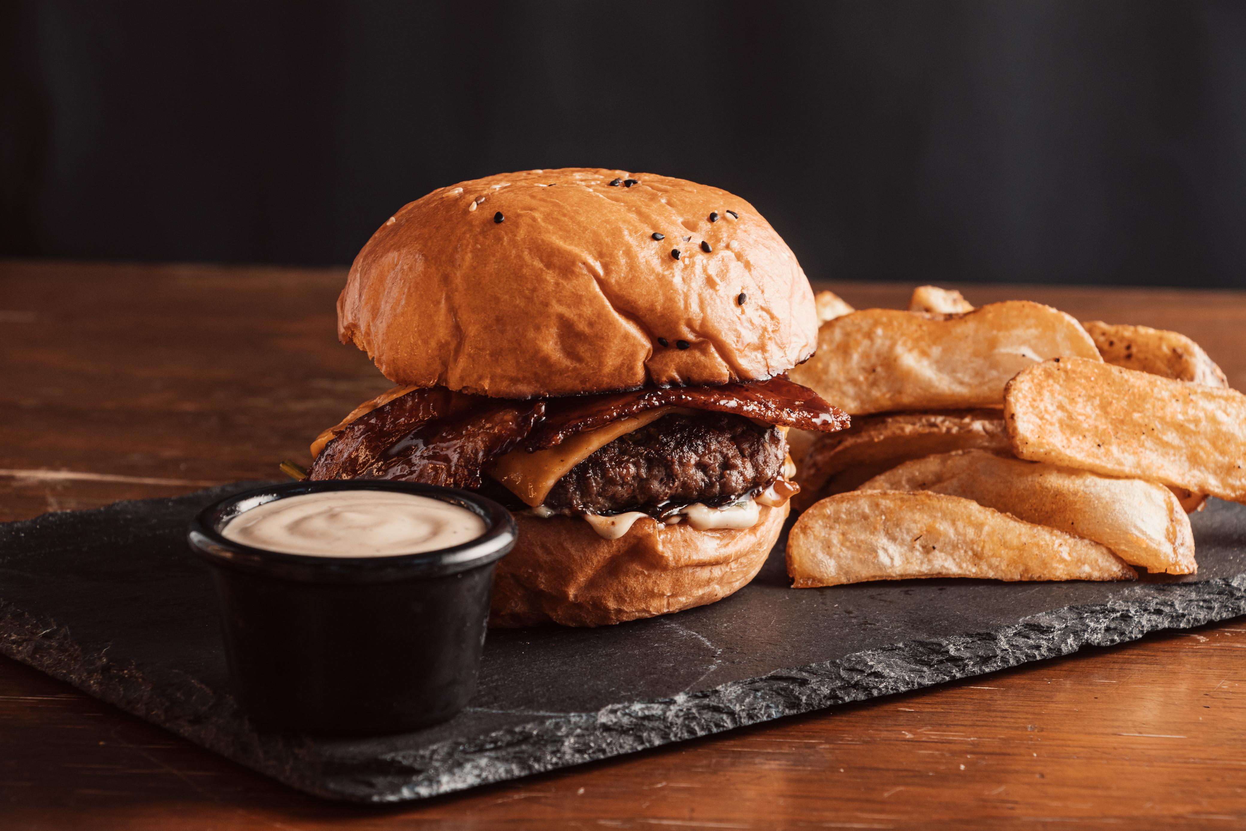 Pan artesanal tipo brioche de origen frances, 150 gr de carne de la casa 100% res, cubierta de queso philadelphia, manzana en reduccion de vino tinto, panceta ahumada, aro de cebolla con tempura de cerveza, tomate y mezclun. Acompañada de papas a elección.