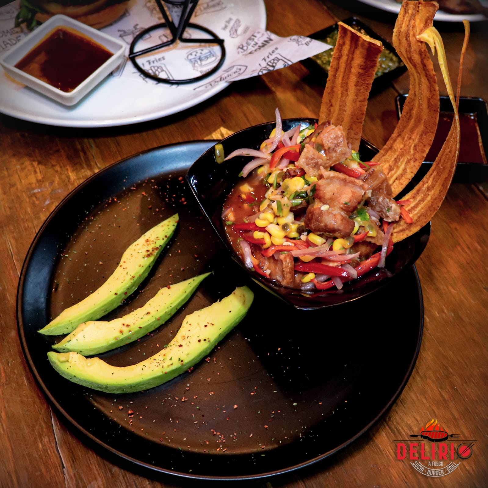 Tocino crocante acevichado con zumo de limón y maracuyá, cebolla roja, ají dulce, maíz tierno y cilantro, acompañado de chips de platanitos chip.