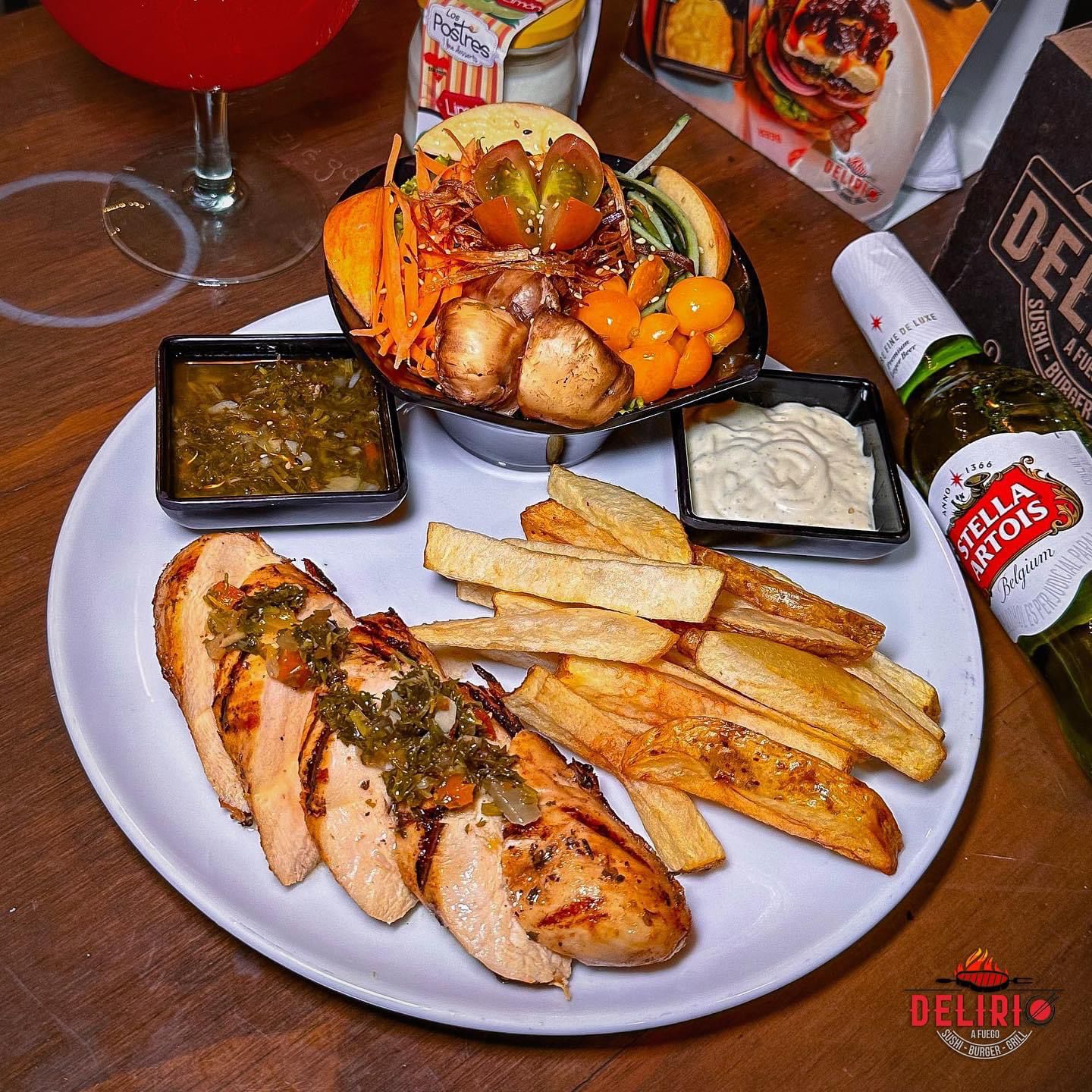300 g De suprema de pollo, bañado en chimichurri, acompañada de papas a elección y ensalada especial de la casa.