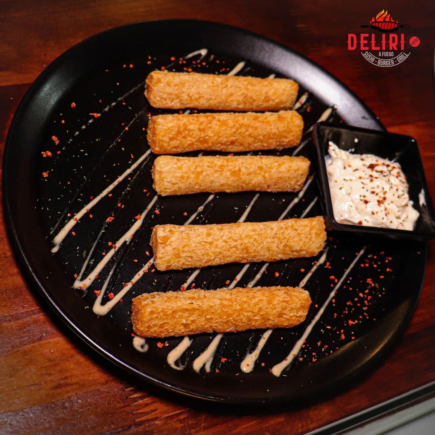 Croquetas de yuca frita, acompañada de sour cream y reducción de maracuyá.