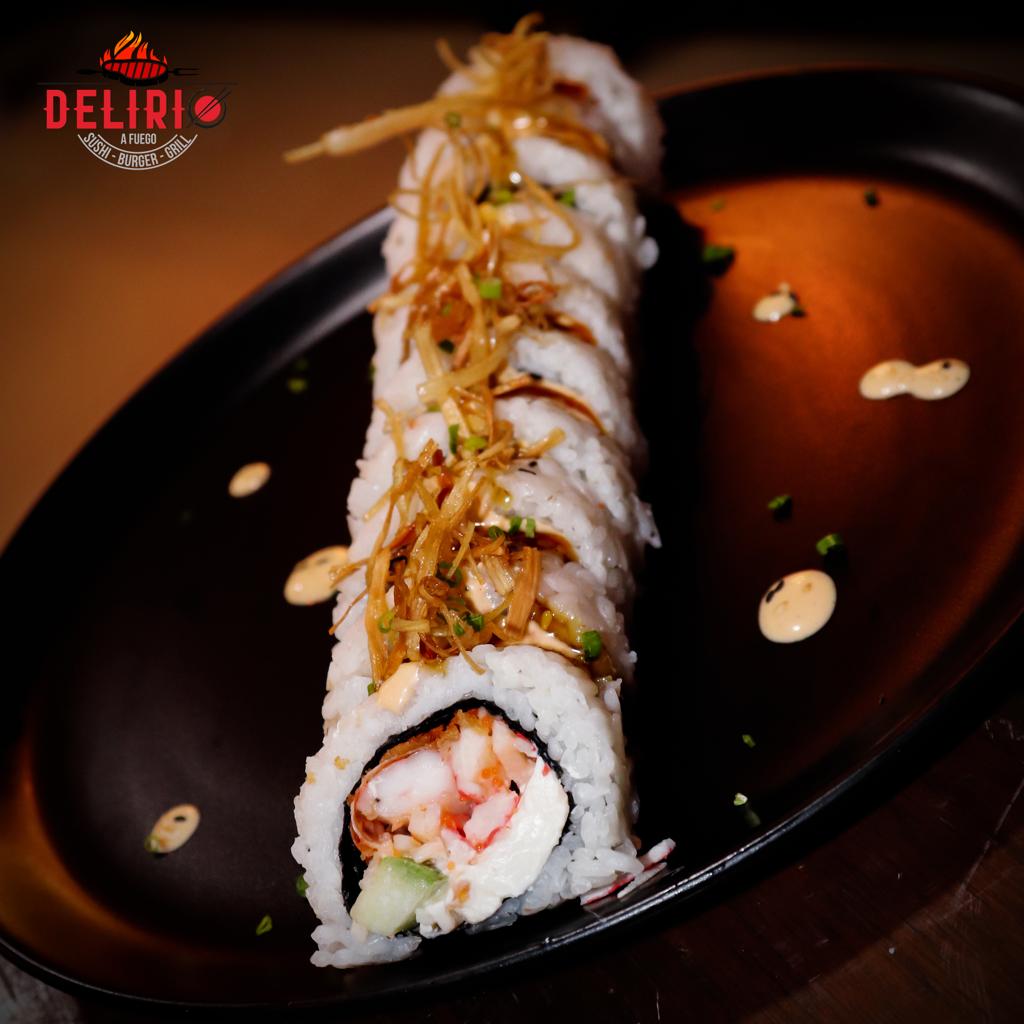 Langostino tempurado con panko, palmito de cangrejo con mayo masago, pepino fresco, queso crema, mayo siracha, salsa teriyaki y cebolla puerro crocante.