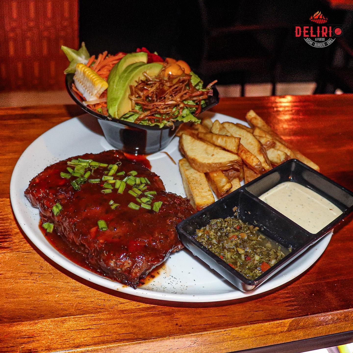 400 g De costilla de cerdo a la parrilla, bañada en BBQ de café y club Colombia negra, acompañado de papas a elección y ensalada especial de la casa.